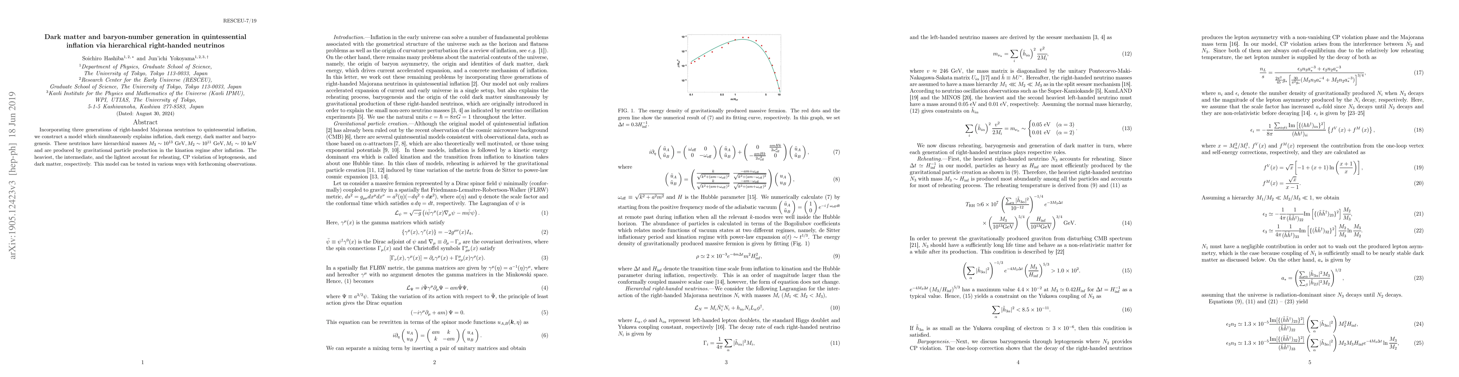 Incorporating three generations of right-handed Majorana neutrinos to quintessential inflation, we construct a model which simultaneously explains inflation, dark energy, dark matter and baryogenesis. These neutrinos have hierarchical masses $M_3 \sim 10^{13}$GeV, $M_2 \sim 10^{11}$GeV, $M_1 \sim 10$keV and are produced by gravitational particle production in the kination regime after inflation. The heaviest, the intermediate, and the lightest account for reheating, CP violation of leptogenesis, and dark matter, respectively. This model can be tested in various ways with forthcoming observations.