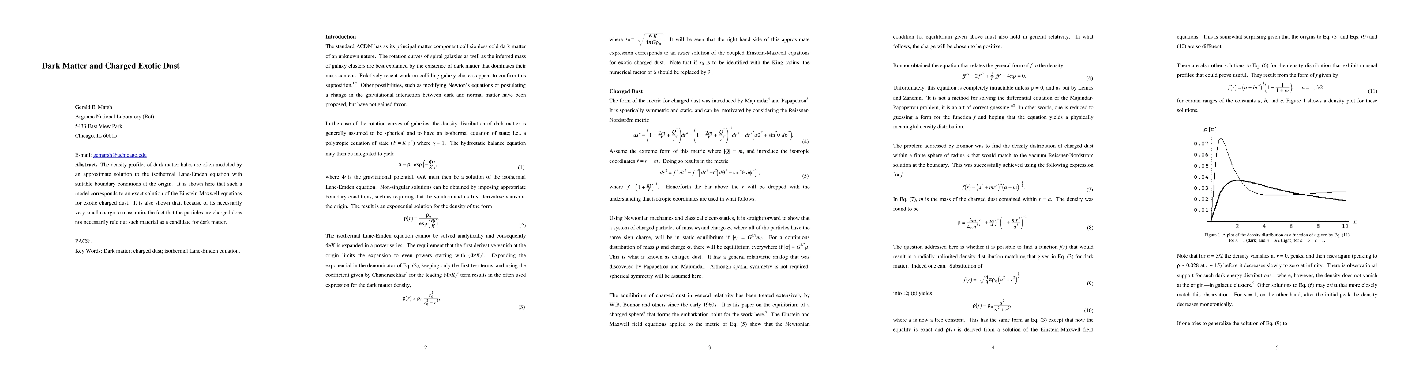 The density profiles of dark matter halos are often modeled by an approximate solution to the isothermal Lane-Emden equation with suitable boundary conditions at the origin. It is shown here that such a model corresponds to an exact solution of the Einstein-Maxwell equations for exotic charged dust. It is also shown that, because of its necessarily very small charge to mass ratio, the fact that the particles are charged does not necessarily rule out such material as a candidate for dark matter.