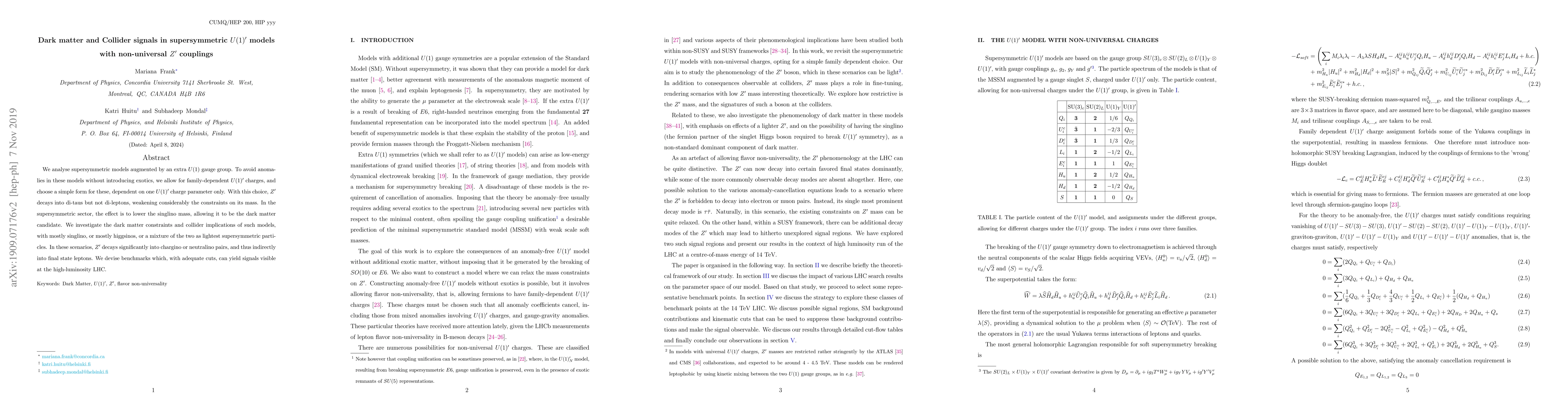 We analyse supersymmetric models augmented by an extra $U(1)$ gauge group. To avoid anomalies in these models without introducing exotics, we allow for family-dependent $U(1)^\prime$ charges, and choose a simple form for these, dependent on one $U(1)^\prime$ charge parameter only. With this choice, $Z^\prime$ decays into di-taus but not di-leptons, weakening considerably the constraints on its mass. In the supersymmetric sector, the effect is to lower the singlino mass, allowing it to be the dark matter candidate. We investigate the dark matter constraints and collider implications of such models, with mostly singlino, or mostly higgsinos, or a mixture of the two as lightest supersymmetric particles. In these scenarios, $Z^\prime$ decays significantly into chargino or neutralino pairs, and thus indirectly into final state leptons. We devise benchmarks which, with adequate cuts, can yield signals visible at the high-luminosity LHC.