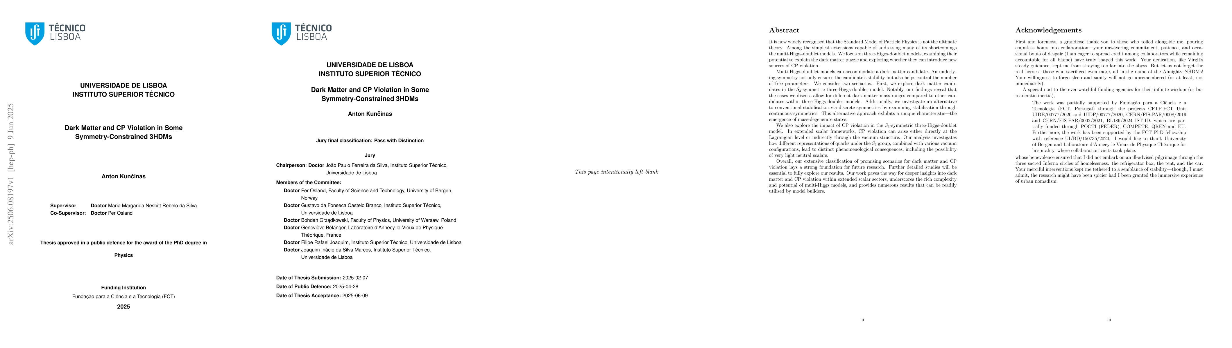 Multi-Higgs-doublet models can accommodate a dark matter candidate. An underlying symmetry not only ensures the candidate's stability but also helps control the number of free parameters. We consider two scenarios. First, we explore dark matter candidates in the $S_3$-symmetric three-Higgs-doublet model. Notably, our findings reveal that the cases we discuss allow for different dark matter mass ranges compared to other candidates within three-Higgs-doublet models. Additionally, we investigate an alternative to conventional stabilisation via discrete symmetries by examining stabilisation through continuous symmetries. This alternative approach exhibits a unique characteristic-the emergence of mass-degenerate states. We also explore the impact of CP violation in the $S_3$-symmetric three-Higgs-doublet model. Our analysis investigates how different representations of quarks under the $S_3$ group, combined with various vacuum configurations, lead to distinct phenomenological consequences, including the possibility of very light neutral scalars.