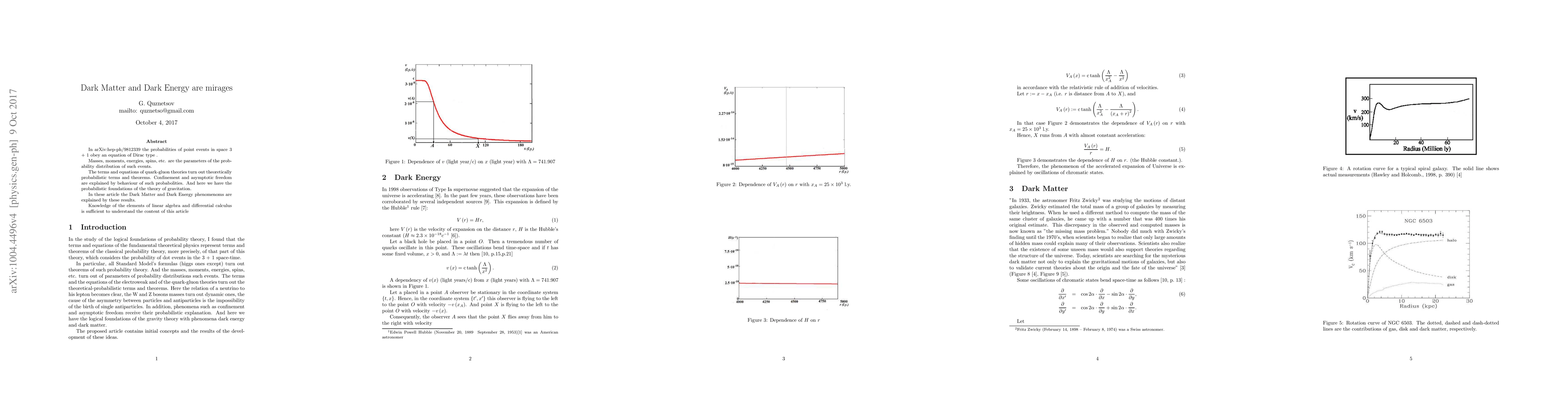 In arXiv:hep-ph/9812339 the probabilities of point events in space 3 + 1 obey an equation of Dirac type . Masses, moments, energies, spins, etc. are the parameters of the probability distribution of such events. The terms and equations of quark-gluon theories turn out theoretically probabilistic terms and theorems. Confinement and asymptotic freedom are explained by behaviour of such probabolities. And here we have the probabilistic foundations of the theory of gravitation. In these article the Dark Matter and Dark Energy phenomenoms are explained by these results. Knowledge of the elements of linear algebra and differential calculus is sufficient to understand the content of this article