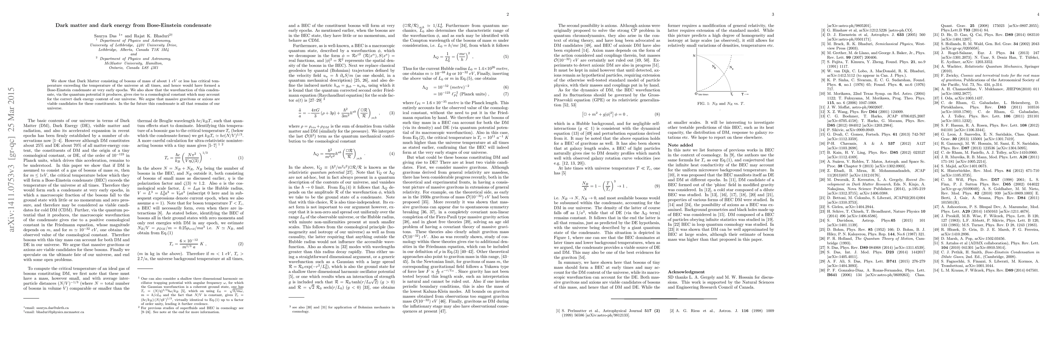 We show that Dark Matter consisting of bosons of mass of about 1eV or less has critical temperature exceeding the temperature of the universe at all times, and hence would have formed a Bose-Einstein condensate at very early epochs. We also show that the wavefunction of this condensate, via the quantum potential it produces, gives rise to a cosmological constant which may account for the correct dark energy content of our universe. We argue that massive gravitons or axions are viable candidates for these constituents. In the far future this condensate is all that remains of our universe.