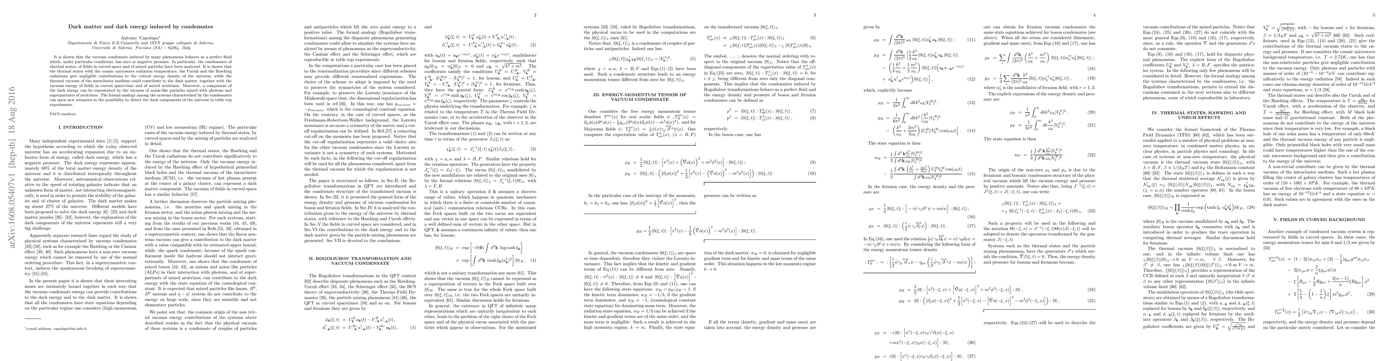 It is shown that the vacuum condensate induced by many phenomena behaves as a perfect fluid which, under particular conditions, has zero or negative pressure. In particular, the condensates of thermal states, of fields in curved space and of mixed particles have been analyzed. It is shown that the thermal states with the cosmic microwave radiation temperature, the Unruh and the Hawking radiations give negligible contributions to the critical energy density of the universe, while the thermal vacuum of the intercluster medium could contribute to the dark matter, together with the vacuum energy of fields in curved space-time and of mixed neutrinos. Moreover, a component of the dark energy can be represented by the vacuum of axion-like particles mixed with photons and superpartners of neutrinos. The formal analogy among the systems characterized by the condensates can open new scenarios in the possibility to detect the dark components of the universe in table top experiments.