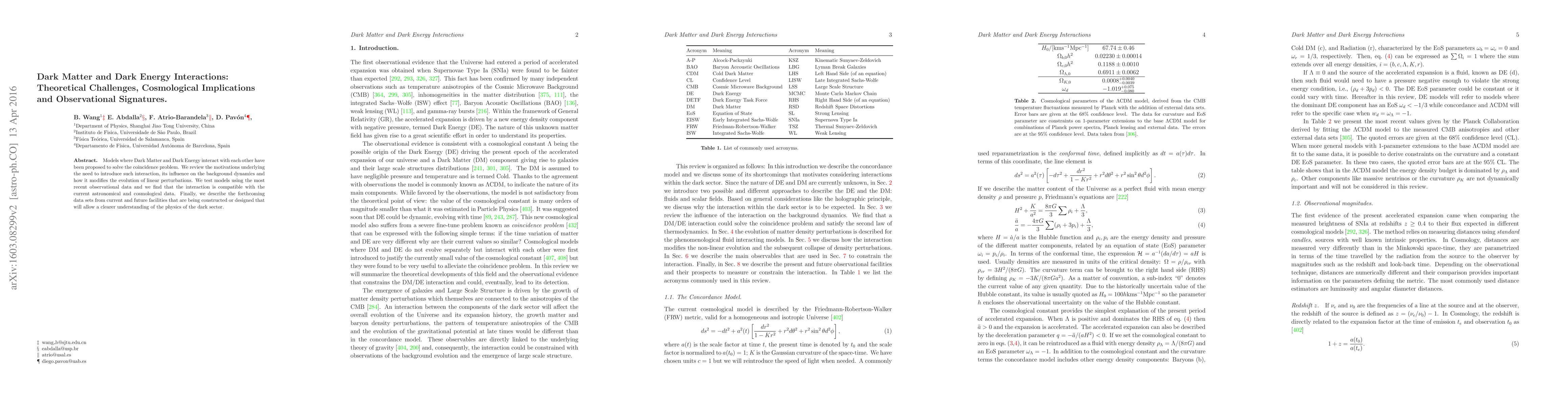 Models where Dark Matter and Dark Energy interact with each other have been proposed to solve the coincidence problem. We review the motivations underlying the need to introduce such interaction, its influence on the background dynamics and how it modifies the evolution of linear perturbations. We test models using the most recent observational data and we find that the interaction is compatible with the current astronomical and cosmological data. Finally, we describe the forthcoming data sets from current and future facilities that are being constructed or designed that will allow a clearer understanding of the physics of the dark sector.
