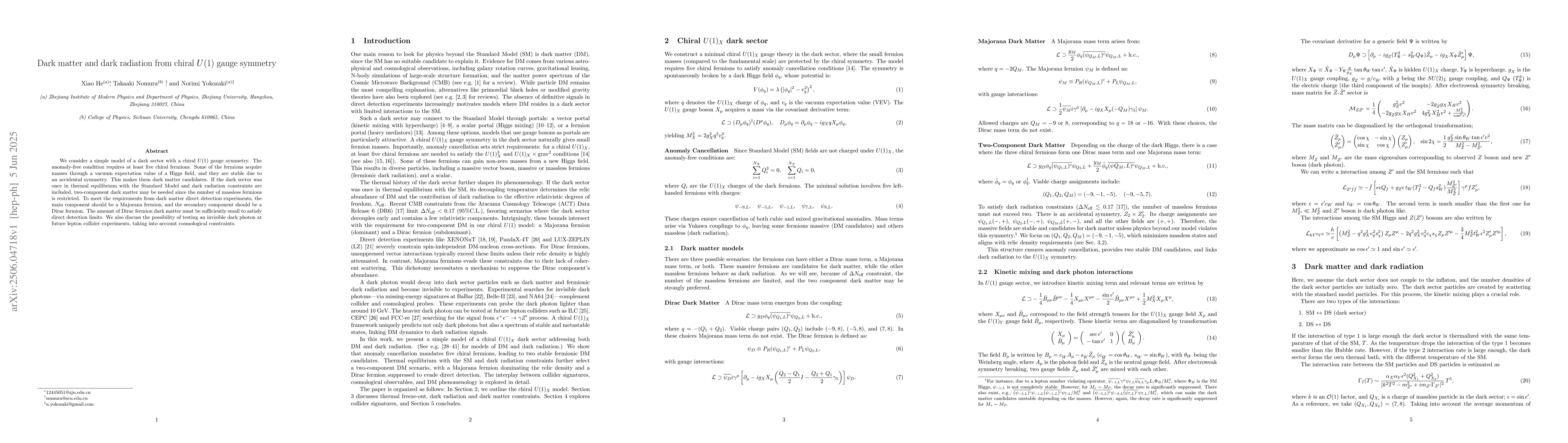 A research paper proposes a model for dark matter and dark radiation from chiral U(1) gauge symmetry, requiring at least five chiral fermions to satisfy anomaly-free conditions. The model predicts two-component dark matter with specific constraints on the Majorana and Dirac fermion components.