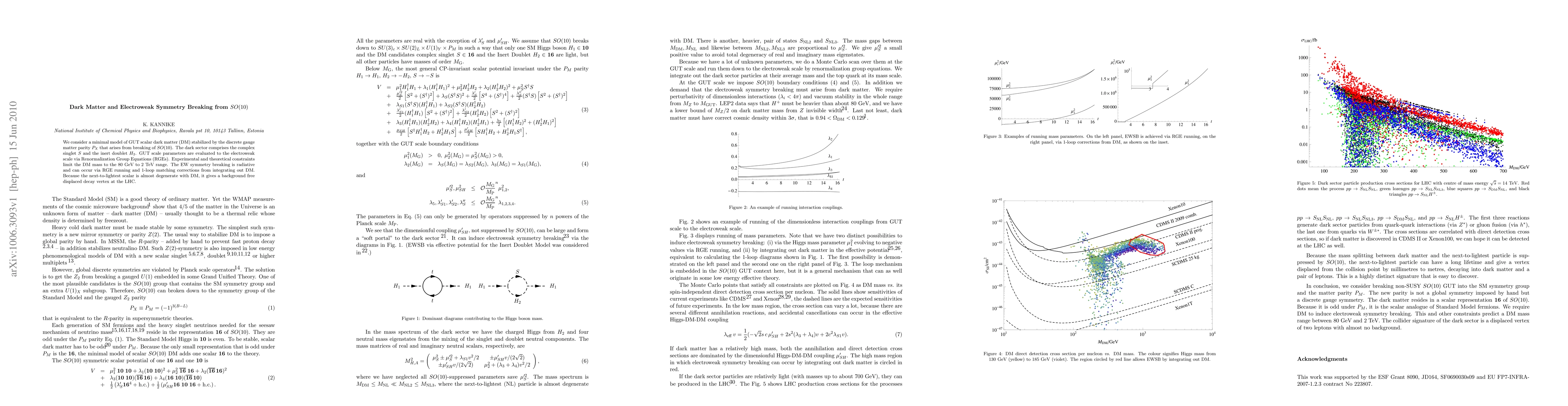 We consider a minimal model of GUT scalar dark matter (DM) stabilized by the discrete gauge matter parity $P_{X}$ that arises from breaking of $SO(10)$. The dark sector comprises the complex singlet $S$ and the inert doublet $H_{2}$. GUT scale parameters are evaluated to the electroweak scale via Renormalization Group Equations (RGEs). Experimental and theoretical constraints limit the DM mass to the 80 GeV to 2 TeV range. The EW symmetry breaking is radiative and can occur via RGE running and 1-loop matching corrections from integrating out DM. Because the next-to-lightest scalar is almost degenerate with DM, it gives a background free displaced decay vertex at the LHC.
