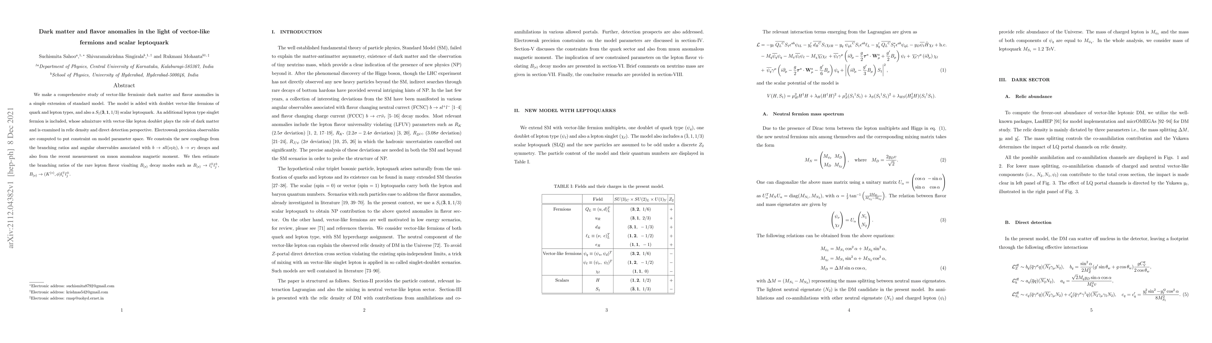 This paper explores a model extending the Standard Model with vector-like fermions and a scalar leptoquark, proposing a vector-like fermion admixture as dark matter. It examines the model's implications for flavor anomalies, relic density, and direct detection, while constraining parameters through electroweak precision tests and recent decay measurements.