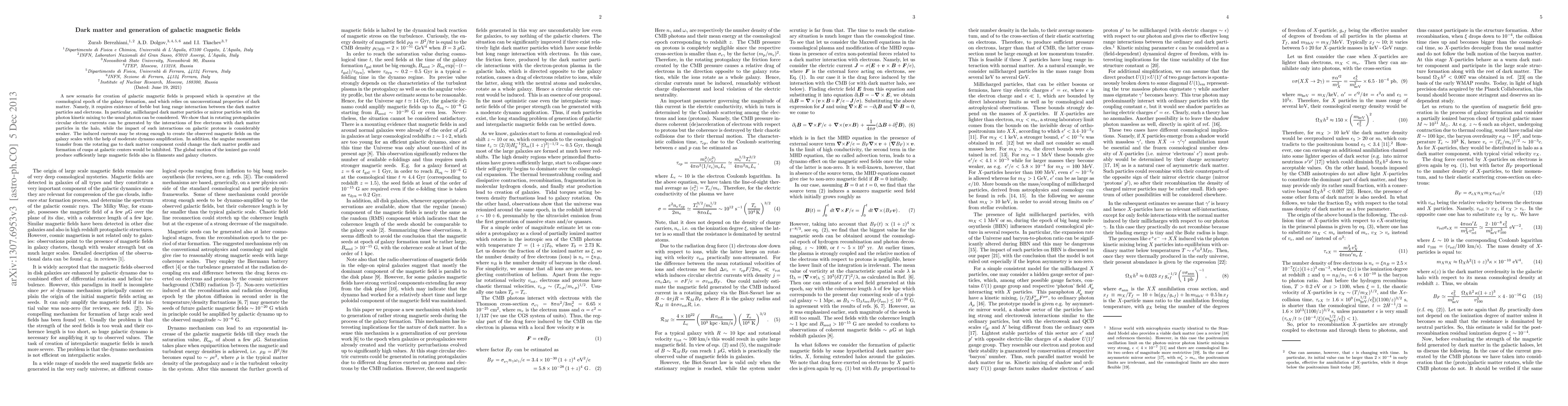 This paper proposes a novel mechanism for generating galactic magnetic fields based on interactions between dark matter and electrons during galaxy formation. It suggests that millicharged dark matter or mirror particles could induce circular electric currents in rotating protogalaxies, leading to the formation of observed galactic magnetic fields through dynamo amplification.