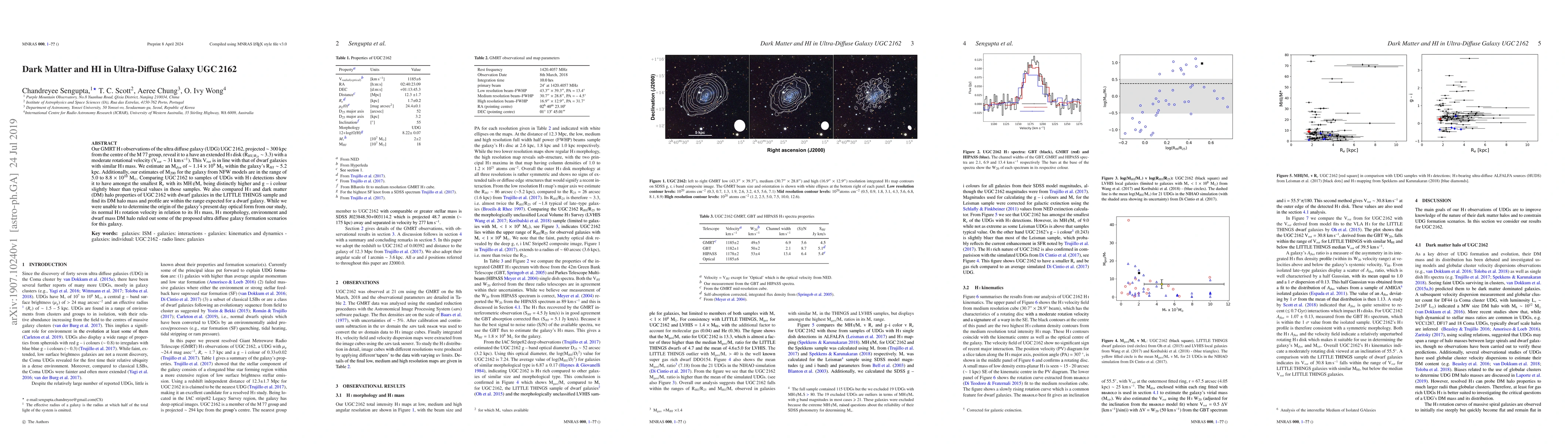 This paper reports GMRT HI observations of the ultra-diffuse galaxy UGC 2162, revealing an extended HI disk and moderate rotational velocity consistent with dwarf galaxies. The study estimates the galaxy's dark matter halo mass and finds its properties align with those of dwarf galaxies, ruling out some ultra-diffuse galaxy formation scenarios.