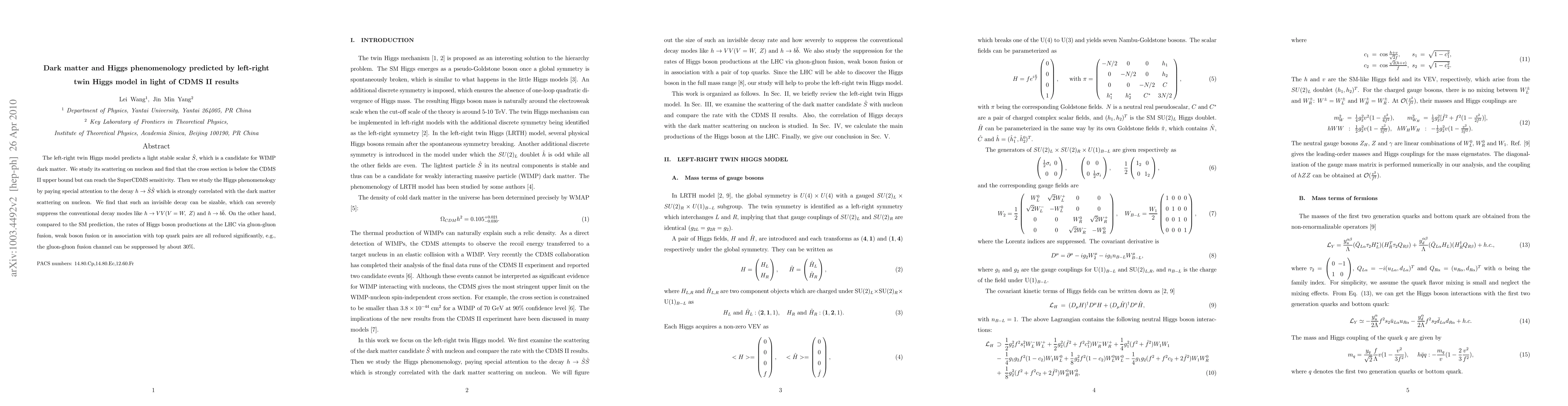 This paper explores the left-right twin Higgs model, predicting a light scalar \hat{S} as a WIMP dark matter candidate. It finds that \hat{S}'s scattering cross-section on nucleons is below CDMS II limits but within reach of SuperCDMS. The study also highlights significant invisible decay of Higgs to \hat{S}\hat{S}, which suppresses conventional decay modes and reduces Higgs production rates at the LHC by up to 30%.