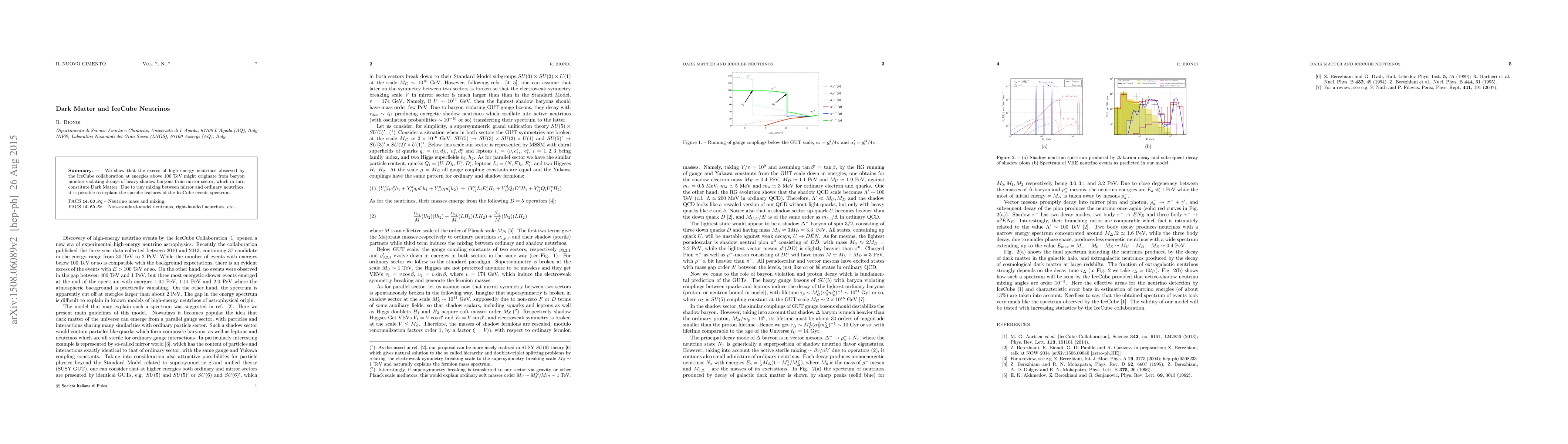 This paper proposes that the high-energy neutrino excess detected by IceCube could stem from the decay of heavy shadow baryons in a mirror sector, which serve as a potential Dark Matter candidate. The study suggests that a small interaction between mirror and ordinary neutrinos can account for the observed characteristics of the neutrino spectrum.