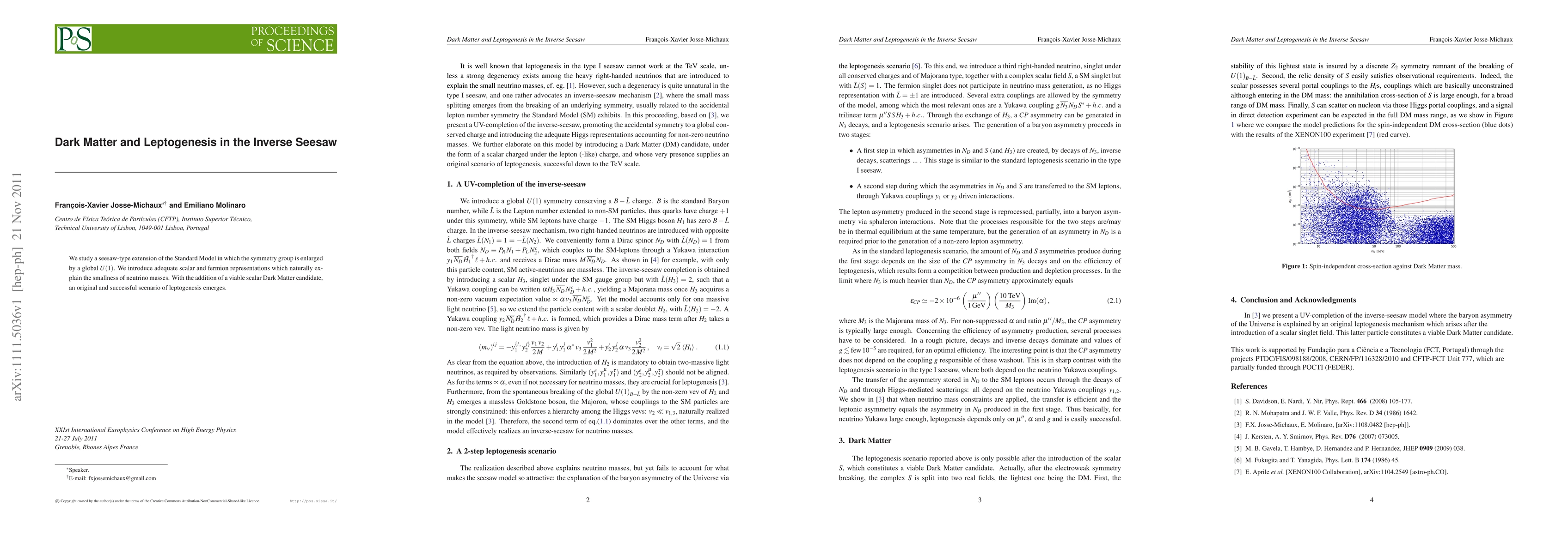 This paper explores an extended Standard Model with an inverse seesaw mechanism and a global U(1) symmetry, explaining small neutrino masses and introducing a viable Dark Matter candidate, while also presenting a successful scenario for leptogenesis.