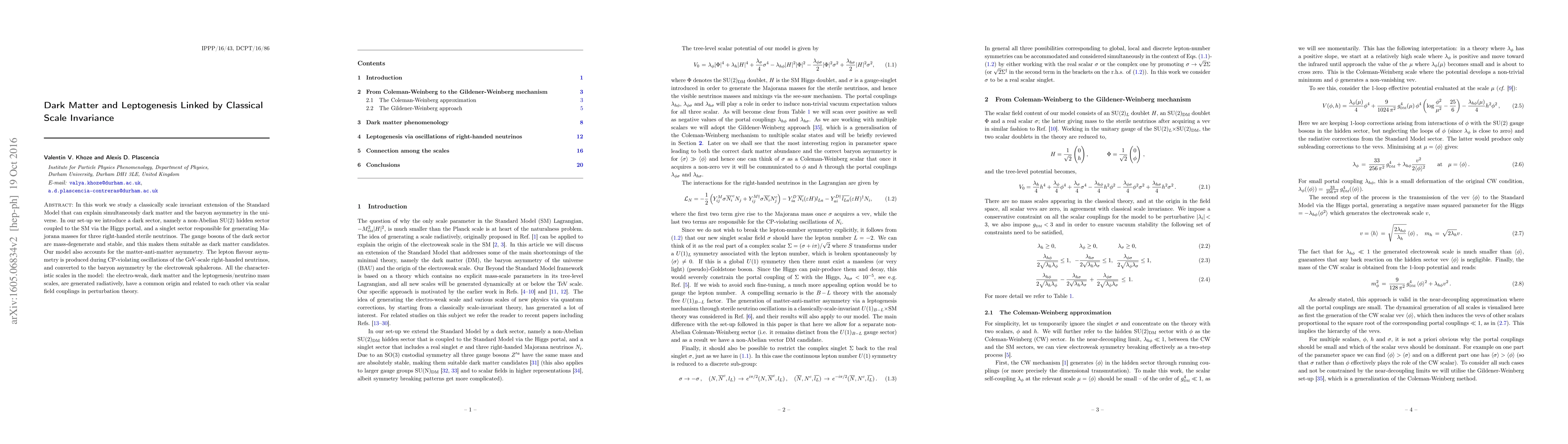 In this work we study a classically scale invariant extension of the Standard Model that can explain simultaneously dark matter and the baryon asymmetry in the universe. In our set-up we introduce a dark sector, namely a non-Abelian SU(2) hidden sector coupled to the SM via the Higgs portal, and a singlet sector responsible for generating Majorana masses for three right-handed sterile neutrinos. The gauge bosons of the dark sector are mass-degenerate and stable, and this makes them suitable as dark matter candidates. Our model also accounts for the matter-anti-matter asymmetry. The lepton flavour asymmetry is produced during CP-violating oscillations of the GeV-scale right-handed neutrinos, and converted to the baryon asymmetry by the electroweak sphalerons. All the characteristic scales in the model: the electro-weak, dark matter and the leptogenesis/neutrino mass scales, are generated radiatively, have a common origin and related to each other via scalar field couplings in perturbation theory.