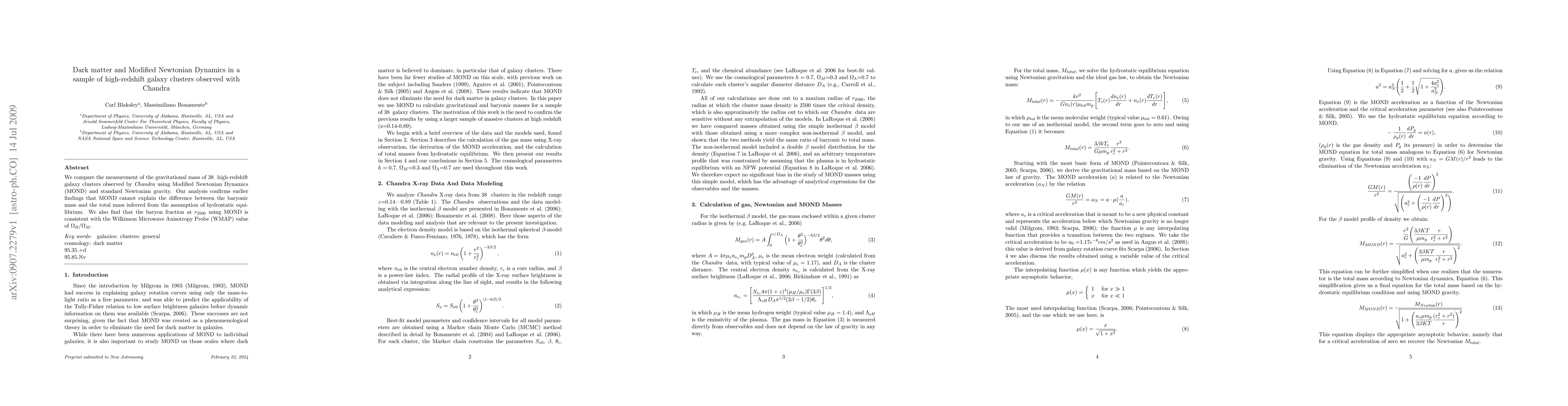 We compare the measurement of the gravitational mass of 38 high-redshift galaxy clusters observed by Chandra using Modified Newtonian Dynamics (MOND) and standard Newtonian gravity. Our analysis confirms earlier findings that MOND cannot explain the difference between the baryonic mass and the total mass inferred from the assumption of hydrostatic equilibrium. We also find that the baryon fraction at $r_{2500}$ using MOND is consistent with the Wilkinson Microwave Anisotropy Probe (WMAP) value of $\Omega_{B}/\Omega_{M}$