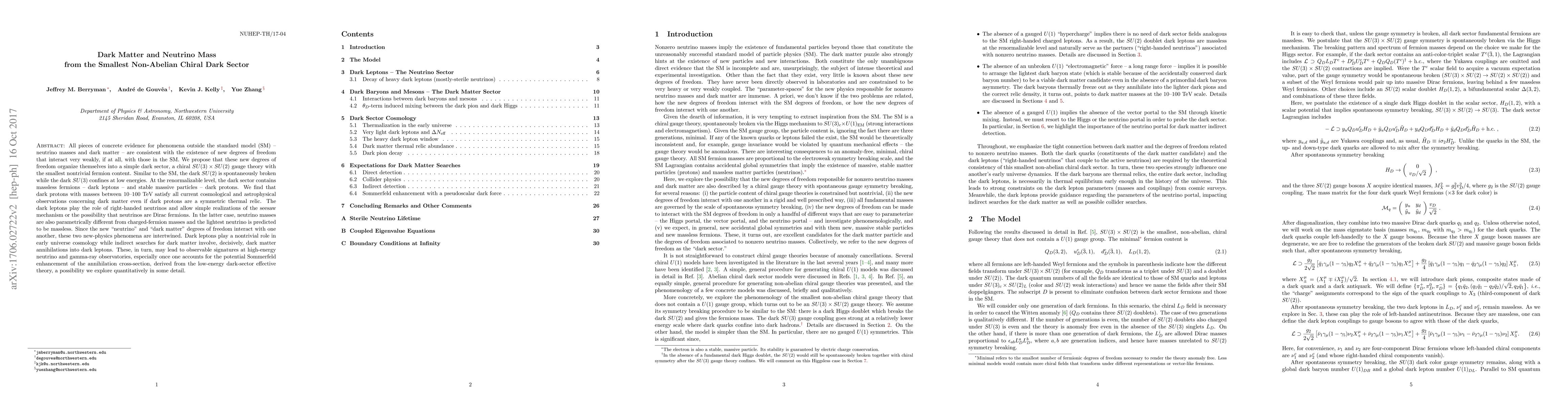 All pieces of concrete evidence for phenomena outside the standard model (SM) - neutrino masses and dark matter - are consistent with the existence of new degrees of freedom that interact very weakly, if at all, with those in the SM. We propose that these new degrees of freedom organize themselves into a simple dark sector, a chiral SU(3) x SU(2) gauge theory with the smallest nontrivial fermion content. Similar to the SM, the dark SU(2) is spontaneously broken while the dark SU(3) confines at low energies. At the renormalizable level, the dark sector contains massless fermions - dark leptons - and stable massive particles - dark protons. We find that dark protons with masses between 10-100 TeV satisfy all current cosmological and astrophysical observations concerning dark matter even if dark protons are a symmetric thermal relic. The dark leptons play the role of right-handed neutrinos and allow simple realizations of the seesaw mechanism or the possibility that neutrinos are Dirac fermions. In the latter case, neutrino masses are also parametrically different from charged-fermion masses and the lightest neutrino is predicted to be massless. Since the new "neutrino" and "dark matter" degrees of freedom interact with one another, these two new-physics phenomena are intertwined. Dark leptons play a nontrivial role in early universe cosmology while indirect searches for dark matter involve, decisively, dark matter annihilations into dark leptons. These, in turn, may lead to observable signatures at high-energy neutrino and gamma-ray observatories, especially once one accounts for the potential Sommerfeld enhancement of the annihilation cross-section, derived from the low-energy dark-sector effective theory, a possibility we explore quantitatively in some detail.