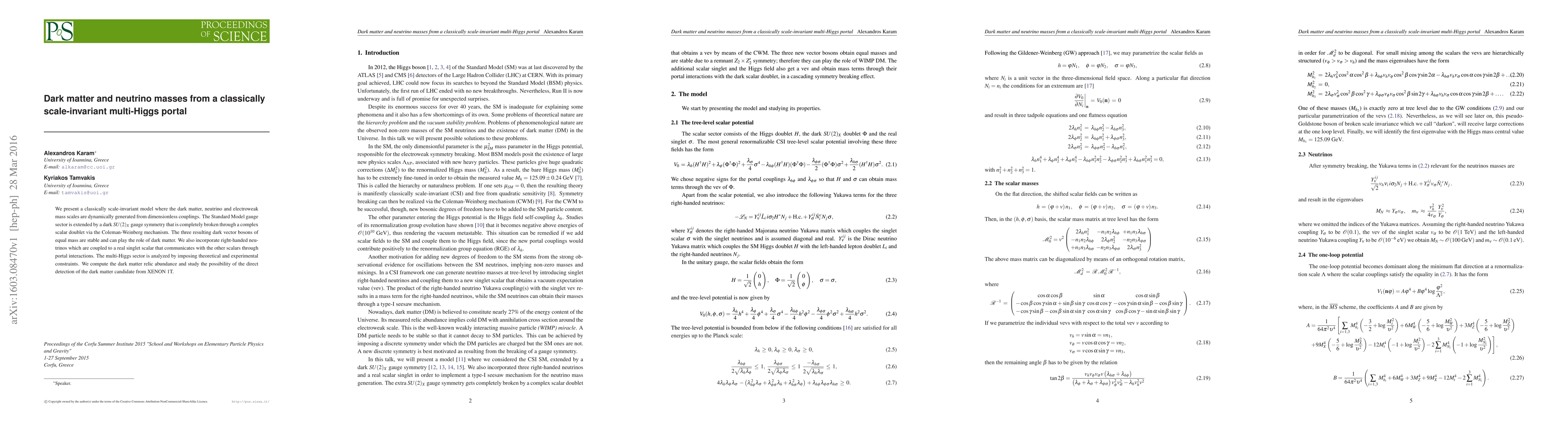 This paper proposes a classically scale-invariant model where dark matter, neutrino masses, and electroweak masses arise from dimensionless couplings. It introduces a dark $SU(2)_X$ gauge symmetry and a multi-Higgs portal, predicting stable dark vector bosons as dark matter and analyzing their relic abundance and detectability.