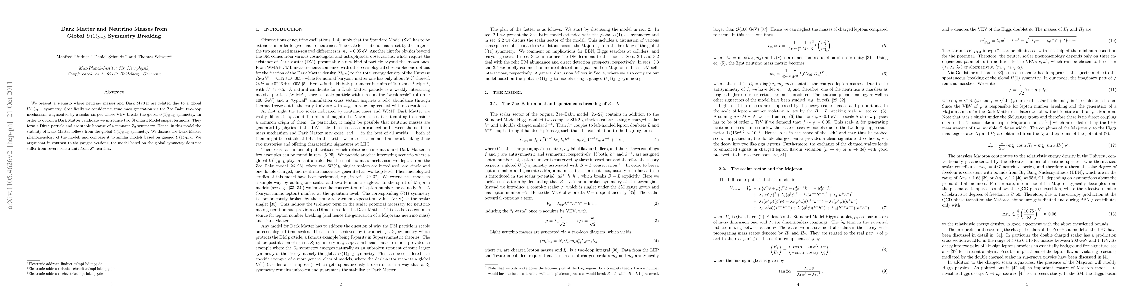 This paper proposes a model where neutrino masses and Dark Matter arise from the breaking of a global $U(1)_{B-L}$ symmetry, utilizing the Zee-Babu mechanism and a scalar singlet. The model introduces stable Dirac fermions as Dark Matter candidates, avoiding stringent $Z'$ constraints compared to gauged $U(1)_{B-L}$ models.