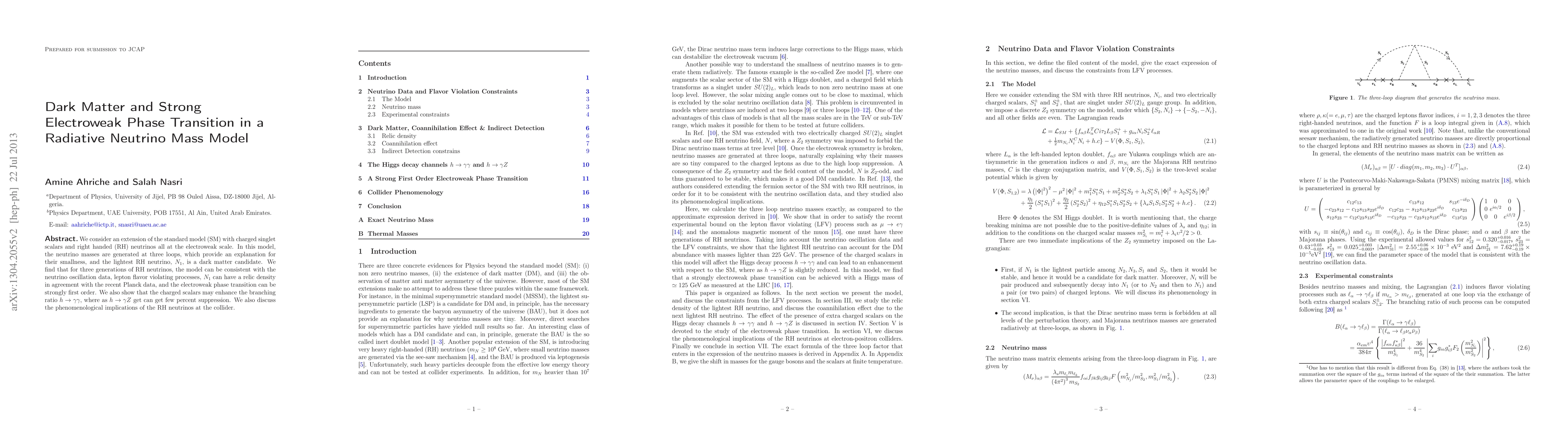 We consider an extension of the standard model (SM) with charged singlet scalars and right handed (RH) neutrinos all at the electroweak scale. In this model, the neutrino masses are generated at three loops, which provide an explanation for their smallness, and the lightest RH neutrino, $N_{1}$, is a dark matter candidate. We find that for three generations of RH neutrinos, the model can be consistent with the neutrino oscillation data, lepton flavor violating processes, $N_{1}$ can have a relic density in agreement with the recent Planck data, and the electroweak phase transition can be strongly first order. We also show that the charged scalars may enhance the branching ratio $h-->YY$, where as $h-->YZ$ get can get few percent suppression. We also discuss the phenomenological implications of the RH neutrinos at the collider.