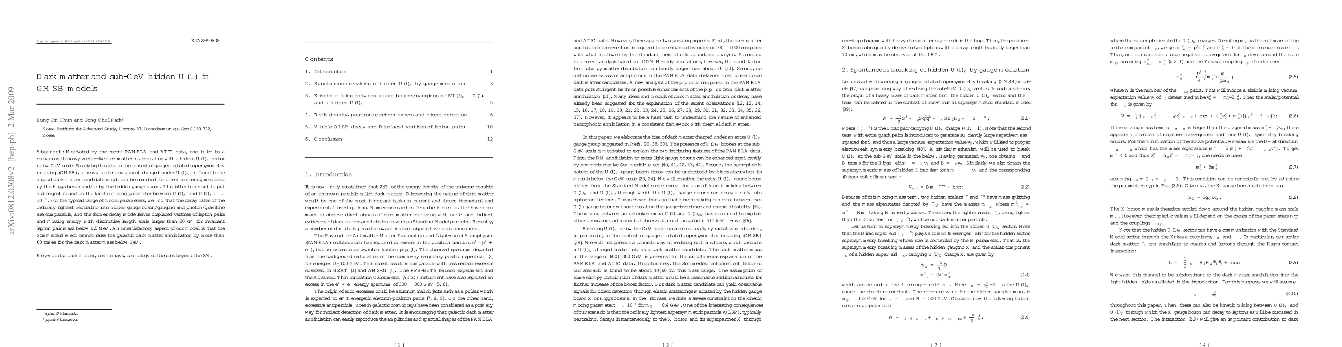 Motivated by the recent PAMELA and ATIC data, one is led to a scenario with heavy vector-like dark matter in association with a hidden $U(1)_X$ sector below GeV scale. Realizing this idea in the context of gauge mediated supersymmetry breaking (GMSB), a heavy scalar component charged under $U(1)_X$ is found to be a good dark matter candidate which can be searched for direct scattering mediated by the Higgs boson and/or by the hidden gauge boson. The latter turns out to put a stringent bound on the kinetic mixing parameter between $U(1)_X$ and $U(1)_Y$: $\theta \lesssim 10^{-6}$. For the typical range of model parameters, we find that the decay rates of the ordinary lightest neutralino into hidden gauge boson/gaugino and photon/gravitino are comparable, and the former decay mode leaves displaced vertices of lepton pairs and missing energy with distinctive length scale larger than 20 cm for invariant lepton pair mass below 0.5 GeV. An unsatisfactory aspect of our model is that the Sommerfeld effect cannot raise the galactic dark matter annihilation by more than 60 times for the dark matter mass below TeV.