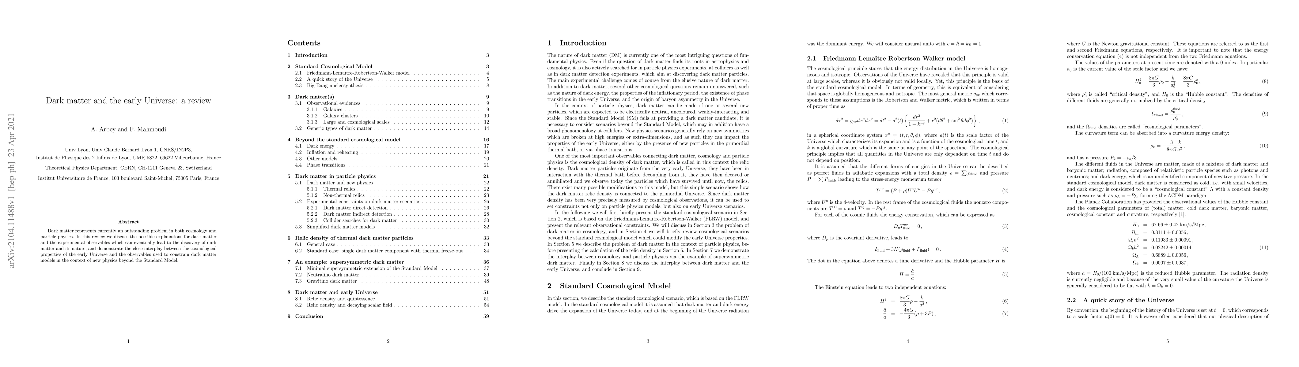 This review explores potential explanations for dark matter, emphasizing experimental observables that may reveal its nature, and highlights the interplay between early Universe cosmology and constraints on dark matter models within the framework of physics beyond the Standard Model.