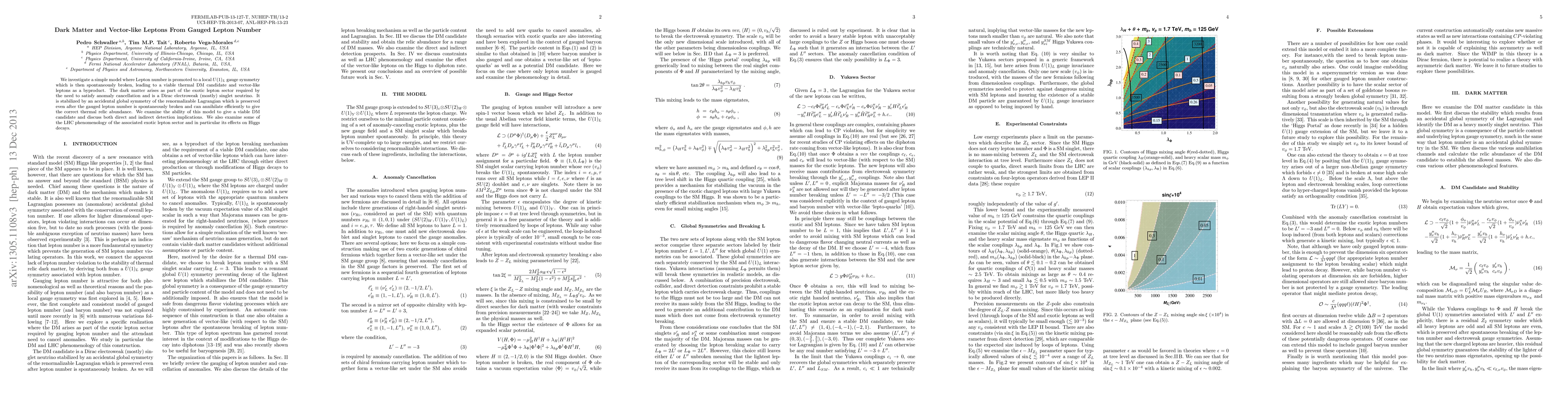 We investigate a simple model where Lepton number is promoted to a local $U(1)_L$ gauge symmetry which is then spontaneously broken, leading to a viable thermal DM candidate and vector-like leptons as a byproduct. The dark matter arises as part of the exotic lepton sector required by the need to satisfy anomaly cancellation and is a Dirac electroweak (mostly) singlet neutrino. It is stabilized by an accidental global symmetry of the renormalizable Lagrangian which is preserved even after the gauged lepton number is spontaneously broken and can annihilate efficiently to give the correct thermal relic abundance. We examine the ability of this model to give a viable DM candidate and discuss both direct and indirect detection implications. We also examine some of the LHC phenomenology of the associated exotic lepton sector and in particular its effects on Higgs decays.