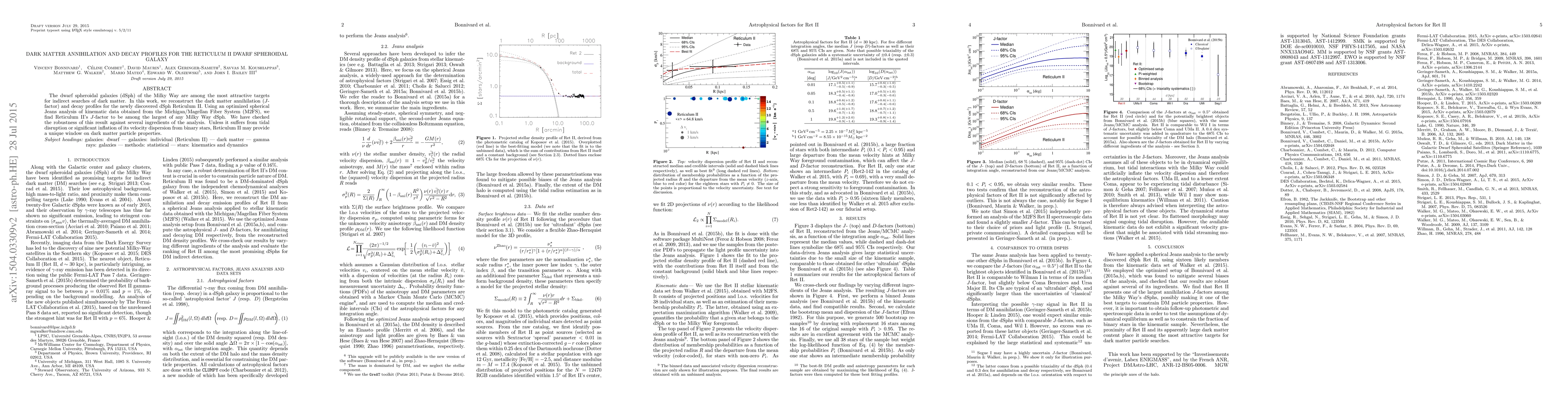 This paper reconstructs the dark matter annihilation and decay profiles for the newly discovered Reticulum II dwarf spheroidal galaxy, finding its J-factor to be among the largest in the Milky Way. The study uses optimized spherical Jeans analysis of kinematic data from the M2FS, confirming the robustness of its results against various analysis factors.