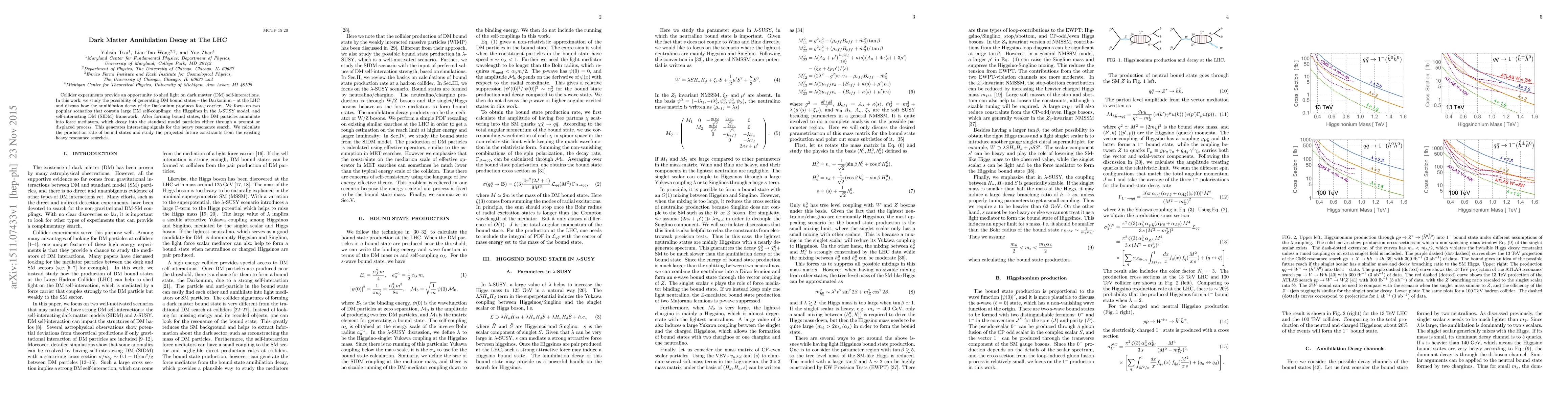 Collider experiments provide an opportunity to shed light on dark matter (DM) self-interactions. In this work, we study the possibility of generating DM bound states -- the Darkonium -- at the LHC and discuss how the annihilation decay of the Darkonium produces force carriers. We focus on two popular scenarios that contain large DM self-couplings: the Higgsinos in the $\lambda$-SUSY model, and self-interacting DM (SIDM) framework. After forming bound states, the DM particles annihilate into force mediators, which decay into the standard model particles either through a prompt or displaced process. This generates interesting signals for the heavy resonance search. We calculate the production rate of bound states and study the projected future constraints from the existing heavy resonance searches.