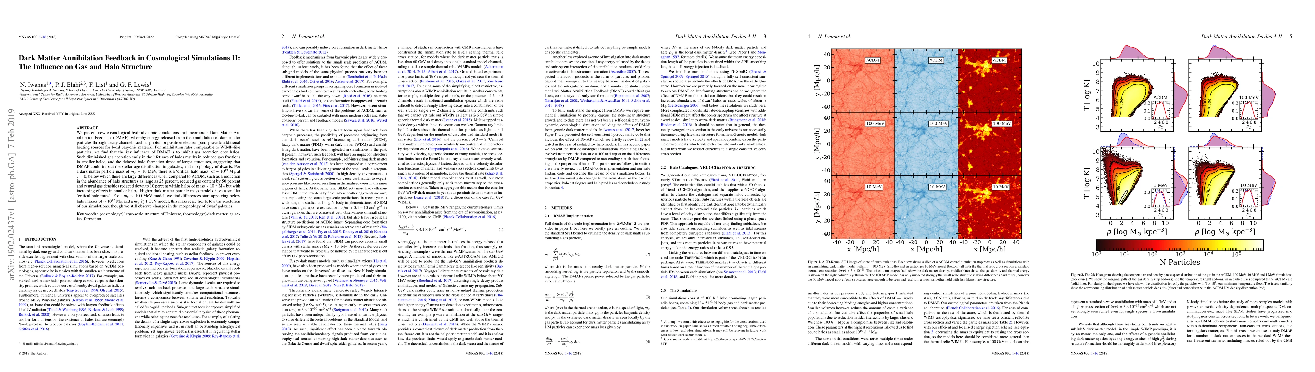 This paper investigates the impact of Dark Matter Annihilation Feedback (DMAF) on gas and halo structure in cosmological simulations. It finds that DMAF inhibits gas accretion onto halos, leading to reduced gas fractions in smaller halos and delayed formation times of larger structures, which could affect stellar age distribution and galaxy morphology.