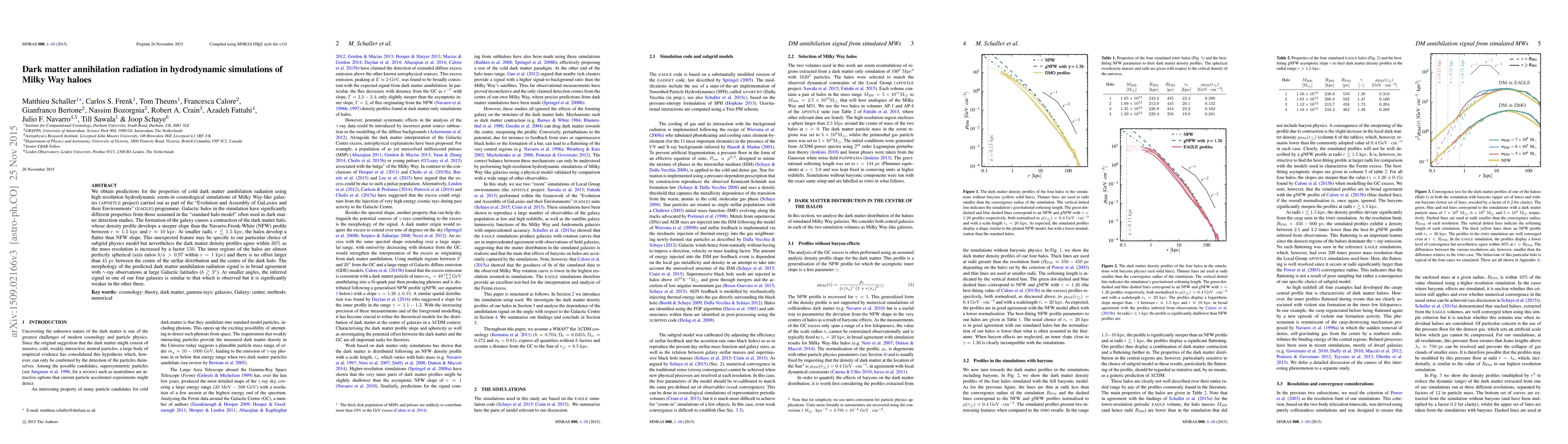 We obtain predictions for the properties of cold dark matter annihilation radiation using high resolution hydrodynamic zoom-in cosmological simulations of Milky Way-like galaxies (APOSTLE project) carried out as part of the "Evolution and Assembly of GaLaxies and their Environments" (EAGLE) programme. Galactic halos in the simulation have significantly different properties from those assumed in the "standard halo model" often used in dark matter detection studies. The formation of the galaxy causes a contraction of the dark matter halo, whose density profile develops a steeper slope than the Navarro-Frenk-White (NFW) profile between $r\approx1.5$ kpc and $r\approx10$ kpc. At smaller radii, $r\lesssim1.5$ kpc, the halos develop a flatter than NFW slope. This unexpected feature may be specific to our particular choice of subgrid physics model but nevertheless the dark matter density profiles agree within 30% as the mass resolution is increased by a factor 150. The inner regions of the halos are almost perfectly spherical (axis ratios $b/a > 0.97$ within $r=1$ kpc) and there is no offset larger than 45 pc between the centre of the stellar distribution and the centre of the dark halo. The morphology of the predicted dark matter annihilation radiation signal is in broad agreement with $\gamma$-ray observations at large Galactic latitudes ($b\gtrsim3^\circ$). At smaller angles, the inferred signal in one of our four galaxies is similar to that which is observed but it is significantly weaker in the other three.