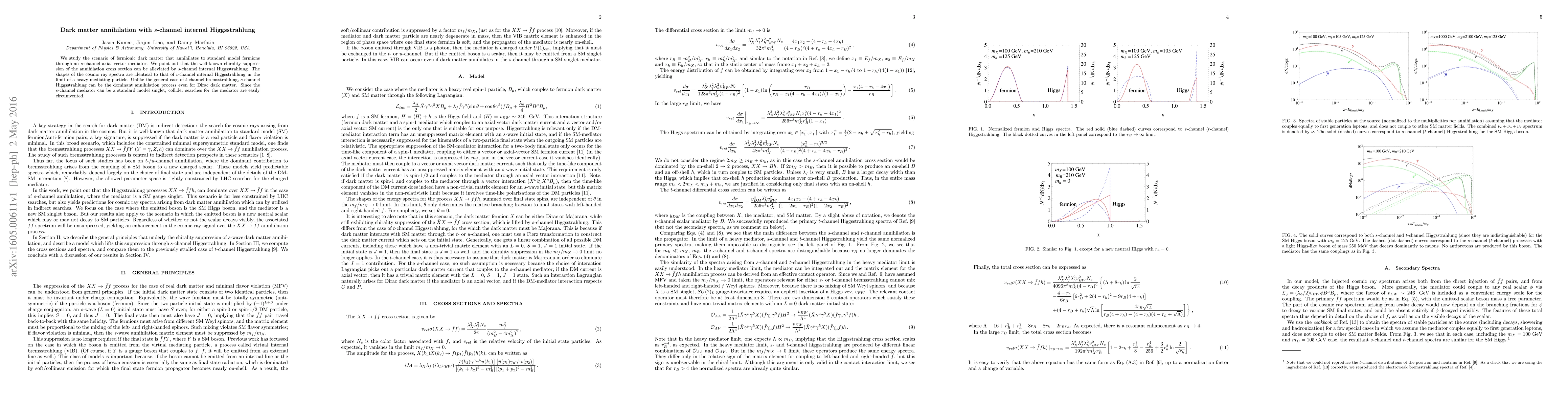 We study the scenario of fermionic dark matter that annihilates to standard model fermions through an s-channel axial vector mediator. We point out that the well-known chirality suppression of the annihilation cross section can be alleviated by s-channel internal Higgsstrahlung. The shapes of the cosmic ray spectra are identical to that of t-channel internal Higgsstrahlung in the limit of a heavy mediating particle. Unlike the general case of t-channel bremsstrahlung, s-channel Higgsstrahlung can be the dominant annihilation process even for Dirac dark matter. Since the s-channel mediator can be a standard model singlet, collider searches for the mediator are easily circumvented.