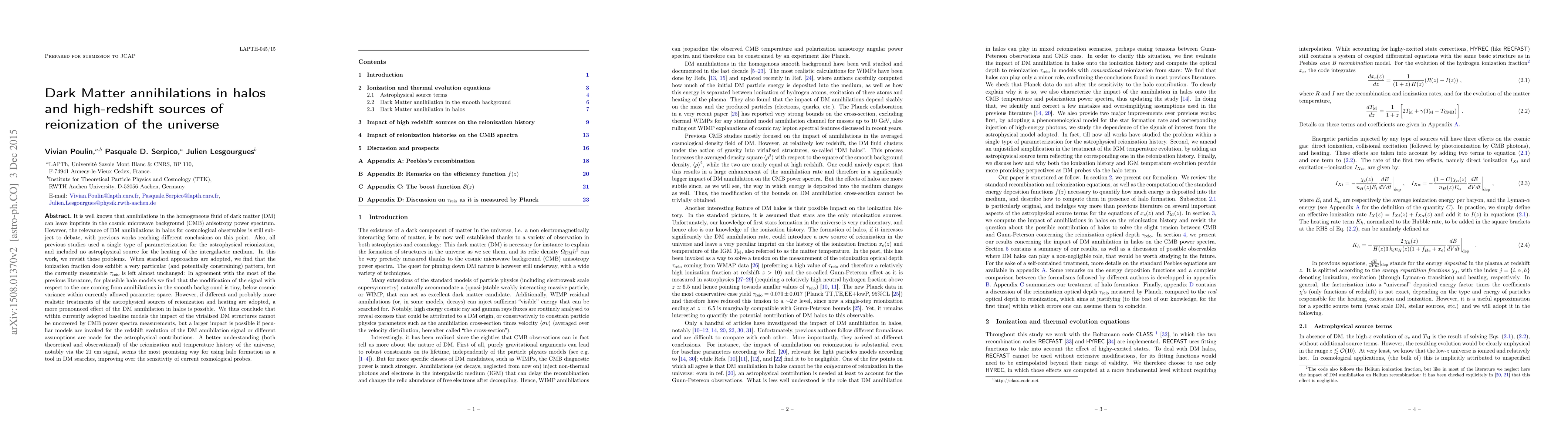 It is well known that annihilations in the homogeneous fluid of dark matter (DM) can leave imprints in the cosmic microwave background (CMB) anisotropy power spectrum. However, the relevance of DM annihilations in halos for cosmological observables is still subject to debate, with previous works reaching different conclusions on this point. Also, all previous studies used a single type of parameterization for the astrophysical reionization, and included no astrophysical source for the heating of the intergalactic medium. In this work, we revisit these problems. When standard approaches are adopted, we find that the ionization fraction does exhibit a very particular (and potentially constraining) pattern, but the currently measurable optical depth to reionization is left almost unchanged: In agreement with the most of the previous literature, for plausible halo models we find that the modification of the signal with respect to the one coming from annihilations in the smooth background is tiny, below cosmic variance within currently allowed parameter space. However, if different and probably more realistic treatments of the astrophysical sources of reionization and heating are adopted, a more pronounced effect of the DM annihilation in halos is possible. We thus conclude that within currently adopted baseline models the impact of the virialised DM structures cannot be uncovered by CMB power spectra measurements, but a larger impact is possible if peculiar models are invoked for the redshift evolution of the DM annihilation signal or different assumptions are made for the astrophysical contributions. A better understanding (both theoretical and observational) of the reionization and temperature history of the universe, notably via the 21 cm signal, seems the most promising way for using halo formation as a tool in DM searches, improving over the sensitivity of current cosmological probes.