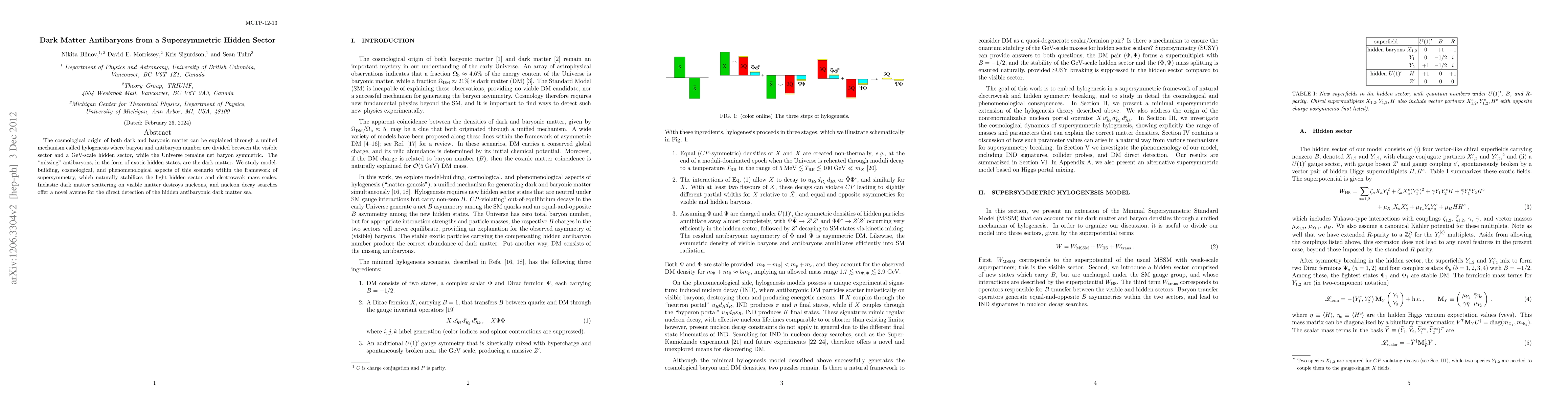 This paper explores a supersymmetric hidden sector to explain the coexistence of dark matter antibaryons and baryonic matter through hylogenesis, proposing that the "missing" antibaryons constitute dark matter. It investigates the model's cosmological and phenomenological implications, suggesting that nucleon decay searches could detect these hidden antibaryonic states.