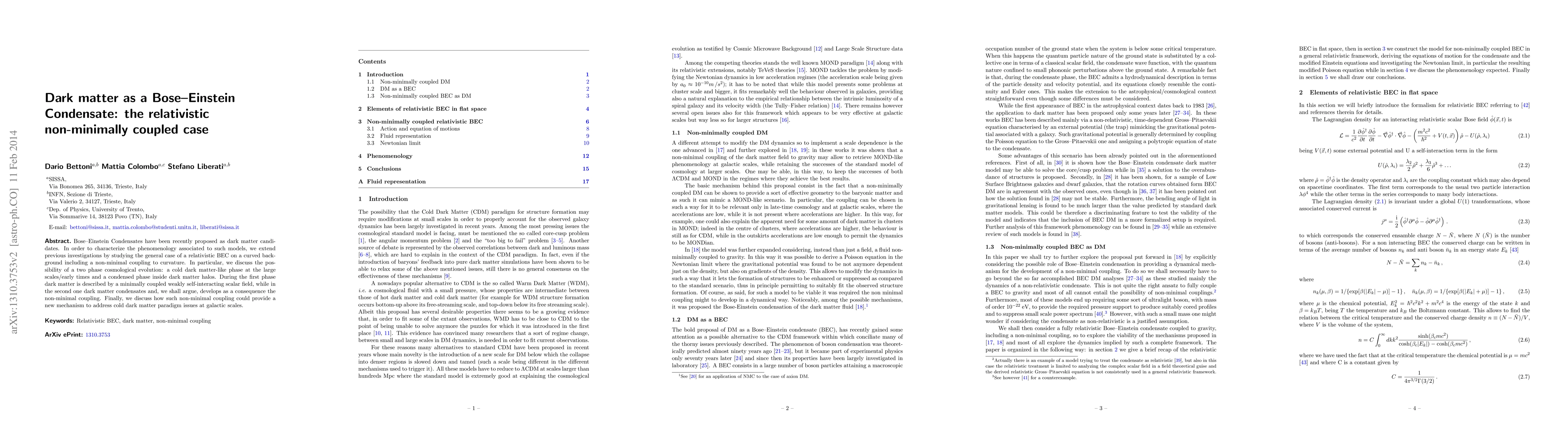 This paper explores the hypothesis that dark matter could be a relativistic Bose-Einstein Condensate (BEC) with non-minimal coupling to curvature, proposing a two-phase cosmological evolution: a cold dark matter phase and a condensed phase within dark matter halos. It suggests that non-minimal coupling could resolve cold dark matter issues at galactic scales.