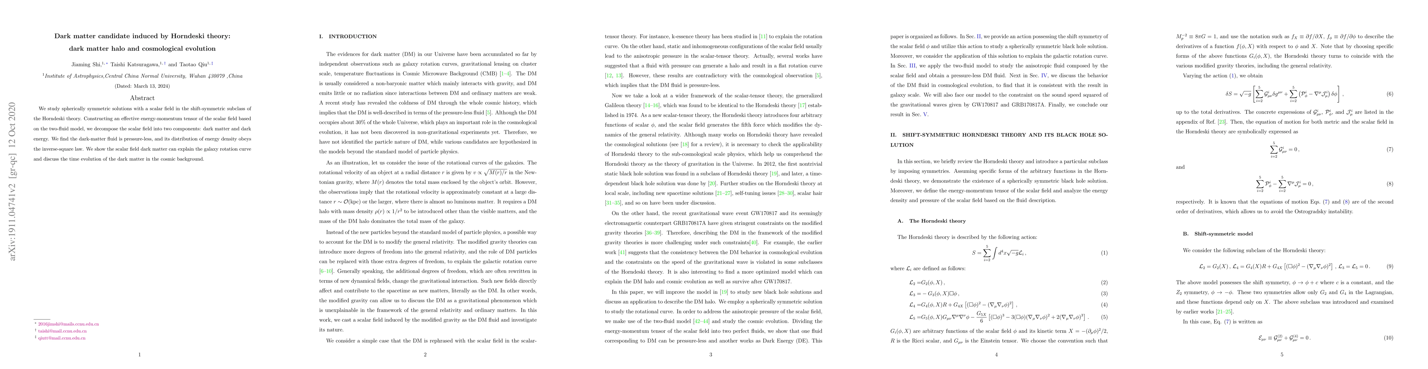 We study spherically symmetric solutions with a scalar field in the shift-symmetric subclass of the Horndeski theory. Constructing an effective energy-momentum tensor of the scalar field based on the two-fluid model, we decompose the scalar field into two components: dark matter and dark energy.We find the dark-matter fluid is pressure-less, and its distribution of energy density obeys the inverse-square law. We show the scalar field dark matter can explain the galaxy rotation curve and discuss the time evolution of the dark matter in the cosmic background.