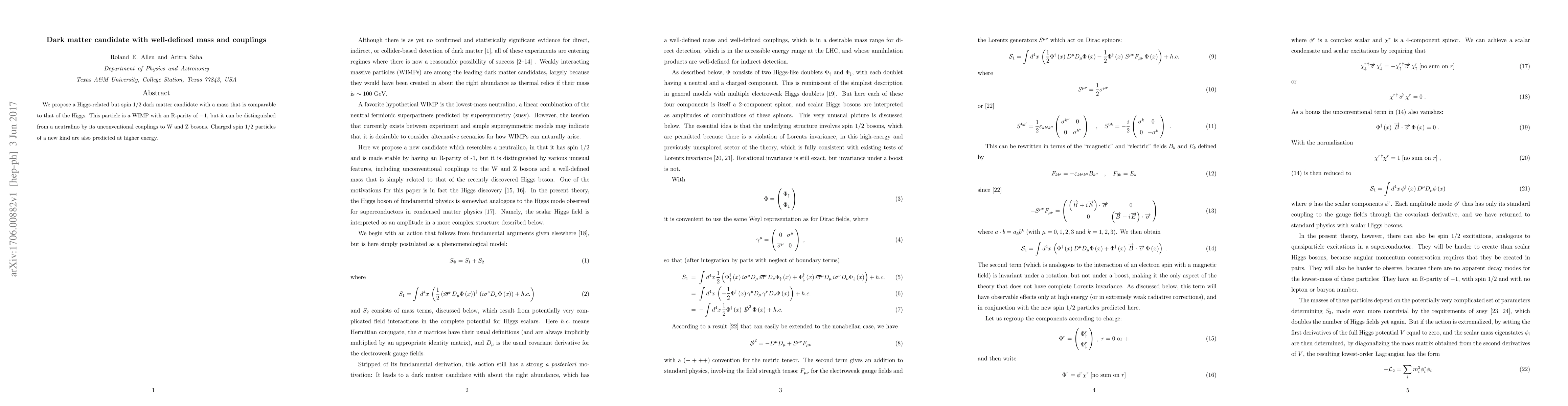 We propose a Higgs-related but spin $1/2$ dark matter candidate with a mass that is comparable to that of the Higgs. This particle is a WIMP with an R-parity of $-1$, but it can be distinguished from a neutralino by its unconventional couplings to W and Z bosons. Charged spin 1/2 particles of a new kind are also predicted at higher energy.