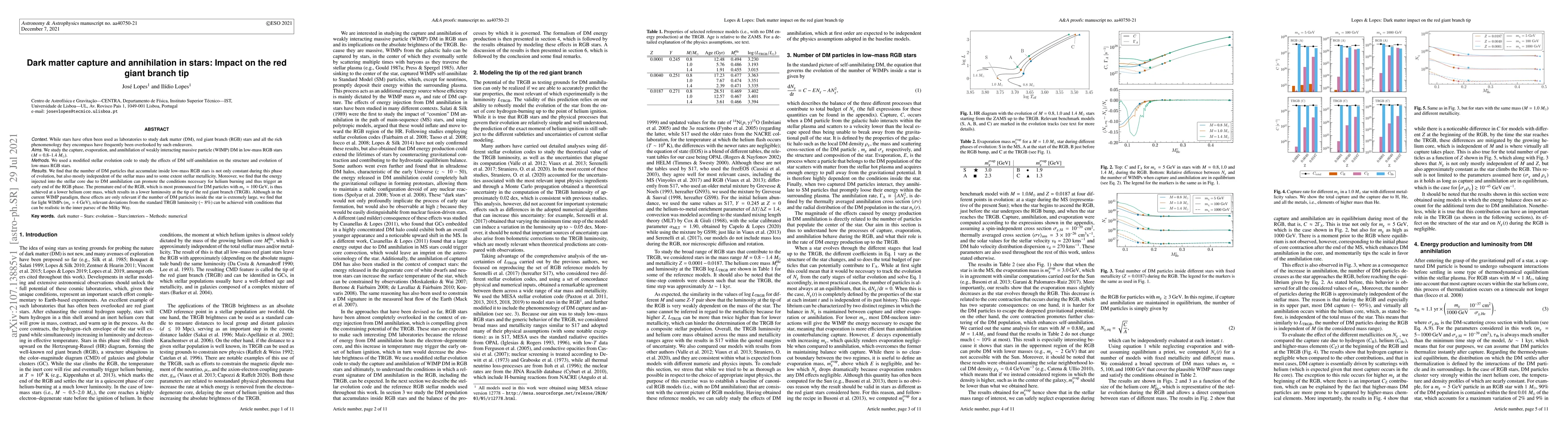 This paper investigates the capture, evaporation, and annihilation of dark matter (DM) in low-mass red giant branch stars, finding that DM self-annihilation can significantly alter the star's evolution, leading to an earlier end of the RGB phase and a lower luminosity at the tip of the red giant branch. For light WIMPs, deviations from standard TRGB luminosity can occur under realistic conditions in the Milky Way's inner regions.