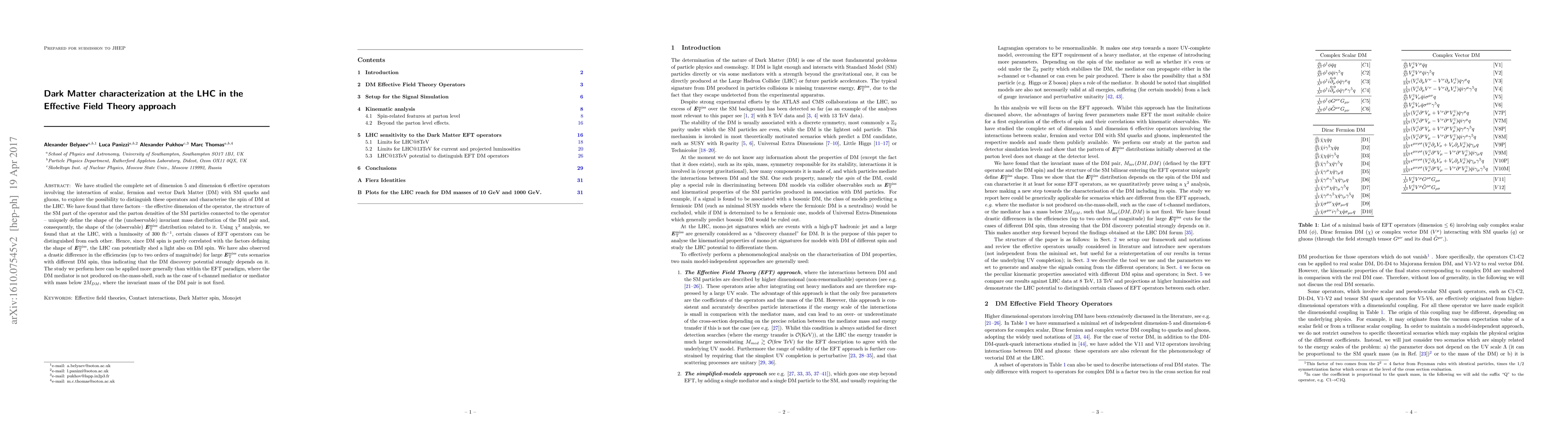 We have studied the complete set of dimension 5 and dimension 6 effective operators involving the interaction of scalar, fermion and vector Dark Matter (DM) with SM quarks and gluons, to explore the possibility to distinguish these operators and characterise the spin of DM at the LHC. We have found that three factors - the effective dimension of the operator, the structure of the SM part of the operator and the parton densities of the SM particles connected to the operator - uniquely define the shape of the (unobservable) invariant mass distribution of the DM pair and, consequently, the shape of the (observable) MET distribution related to it. Using $\chi^2$ analysis, we found that at the LHC, with a luminosity of 300 fb$^{-1}$, certain classes of EFT operators can be distinguished from each other. Hence, since DM spin is partly correlated with the factors defining the shape of MET, the LHC can potentially shed a light also on DM spin. We have also observed a drastic difference in the efficiencies (up to two orders of magnitude) for large MET cuts scenarios with different DM spin, thus indicating that the DM discovery potential strongly depends on it. The study we perform here can be applied more generally than within the EFT paradigm, where the DM mediator is not produced on-the-mass-shell, such as the case of t-channel mediator or mediator with mass below $2M_{DM}$, where the invariant mass of the DM pair is not fixed.