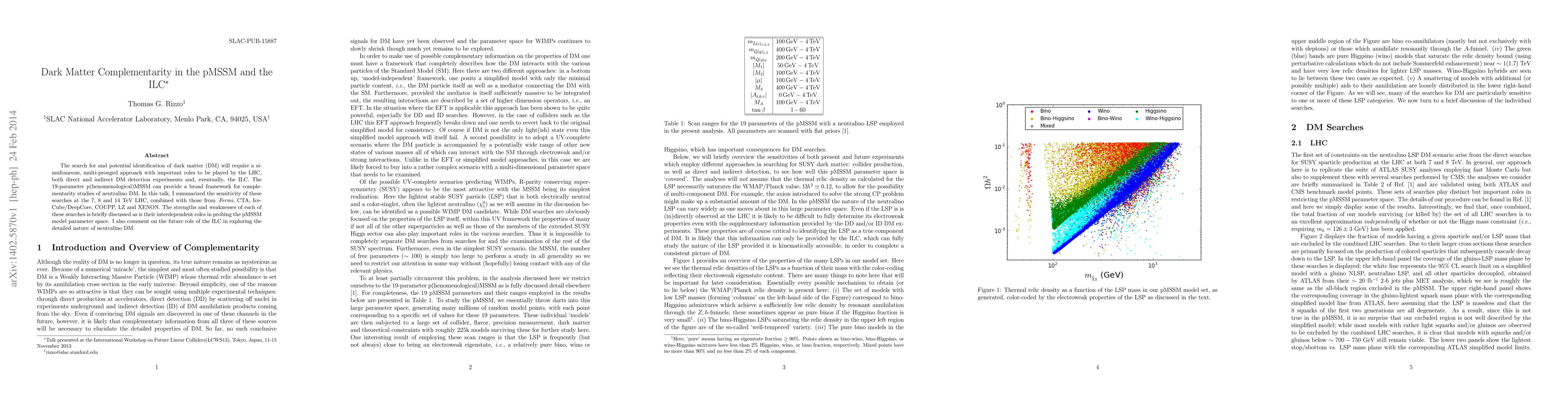 The search for and potential identification of dark matter (DM) will require a simultaneous, multi-pronged approach with important roles to be played by the LHC, both direct and indirect DM detection experiments and, eventually, the ILC. The 19-parameter p(henomenological)MSSM can provide a broad framework for complementarity studies of neutralino DM. In this talk, I summarized the sensitivity of these searches at the 7, 8 and 14 TeV LHC, combined with those from \Fermi, CTA, IceCube/DeepCore, COUPP, LZ and XENON. The strengths and weaknesses of each of these searches is briefly discussed as is their interdependent roles in probing the pMSSM model parameter space. I also comment on the future role of the ILC in exploring the detailed nature of neutralino DM.