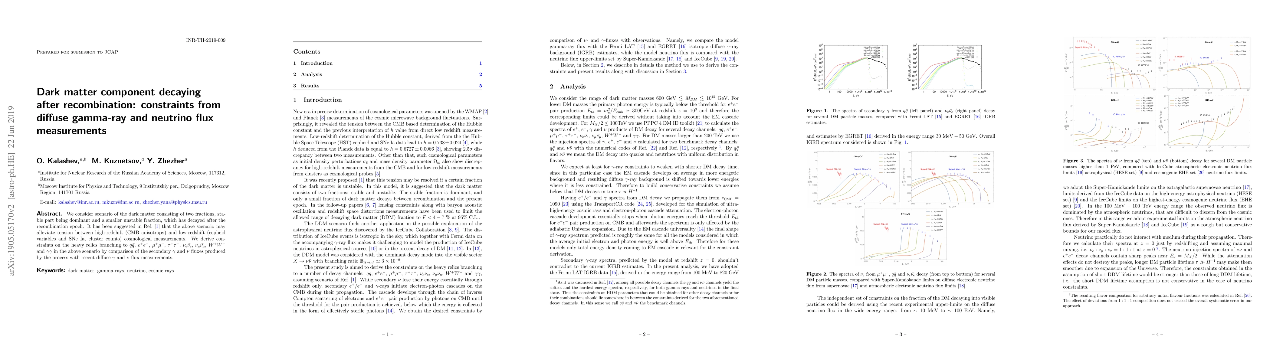 This research paper explores a dark matter component that decays after recombination, testing its compatibility with high-redshift and low-redshift cosmological measurements. It sets constraints on various particle decay channels using diffuse gamma-ray and neutrino flux measurements.