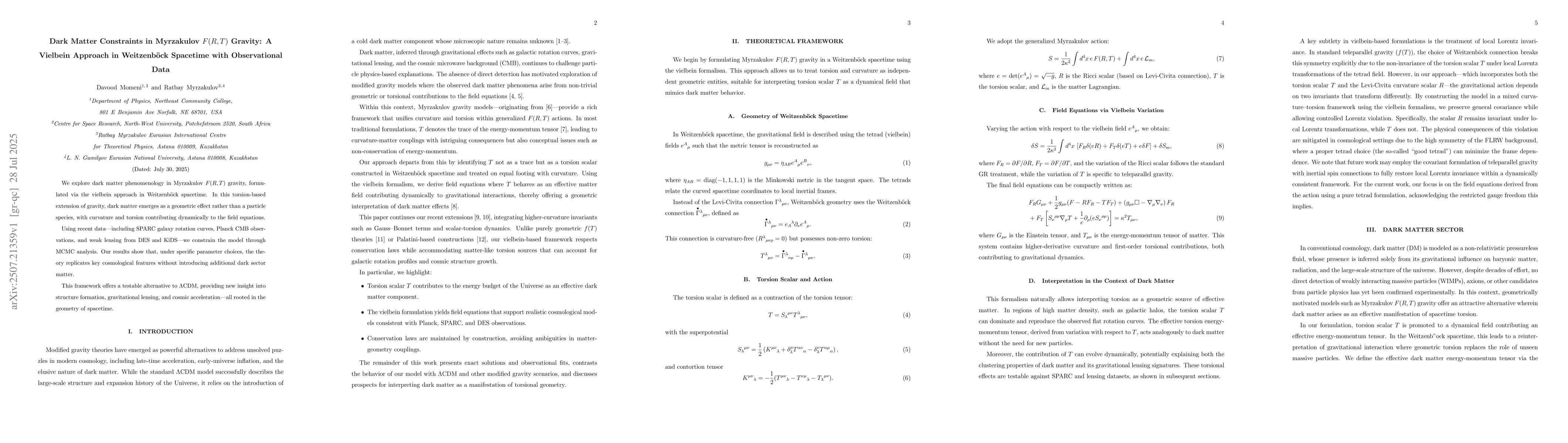 We explore dark matter phenomenology in Myrzakulov $F(R,T)$ gravity, formulated via the vielbein approach in Weitzenb\"{o}ck spacetime. In this torsion-based extension of gravity, dark matter emerges as a geometric effect rather than a particle species, with curvature and torsion contributing dynamically to the field equations. Using recent data -- including SPARC galaxy rotation curves, Planck CMB observations, and weak lensing from DES and KiDS -- we constrain the model through MCMC analysis. Our results show that, under specific parameter choices, the theory replicates key cosmological features without introducing additional dark sector matter. This framework offers a testable alternative to $\Lambda$CDM, providing new insight into structure formation, gravitational lensing, and cosmic acceleration -- all rooted in the geometry of spacetime.