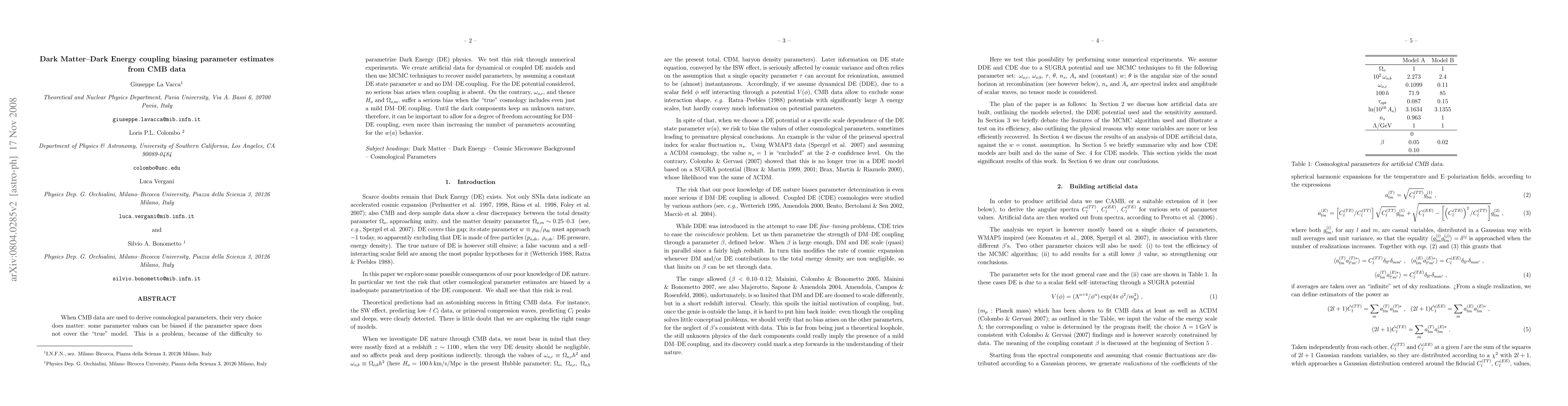 When CMB data are used to derive cosmological parameters, their very choice does matter: some parameter values can be biased if the parameter space does not cover the "true" model. This is a problem, because of the difficulty to parametrize Dark Energy (DE) physics. We test this risk through numerical experiments. We create artificial data for dynamical or coupled DE models and then use MCMC techniques to recover model parameters, by assuming a constant DE state parameter w and no DM--DE coupling. For the DE potential considered, no serious bias arises when coupling is absent. On the contrary, \omega_{o,c}, and thence H_o and \Omega_{o,m}, suffer a serious bias when the "true" cosmology includes even just a mild DM--DE coupling. Until the dark components keep an unknown nature, therefore, it can be important to allow for a degree of freedom accounting for DM--DE coupling, even more than increasing the number of parameters accounting for the w(a) behavior.