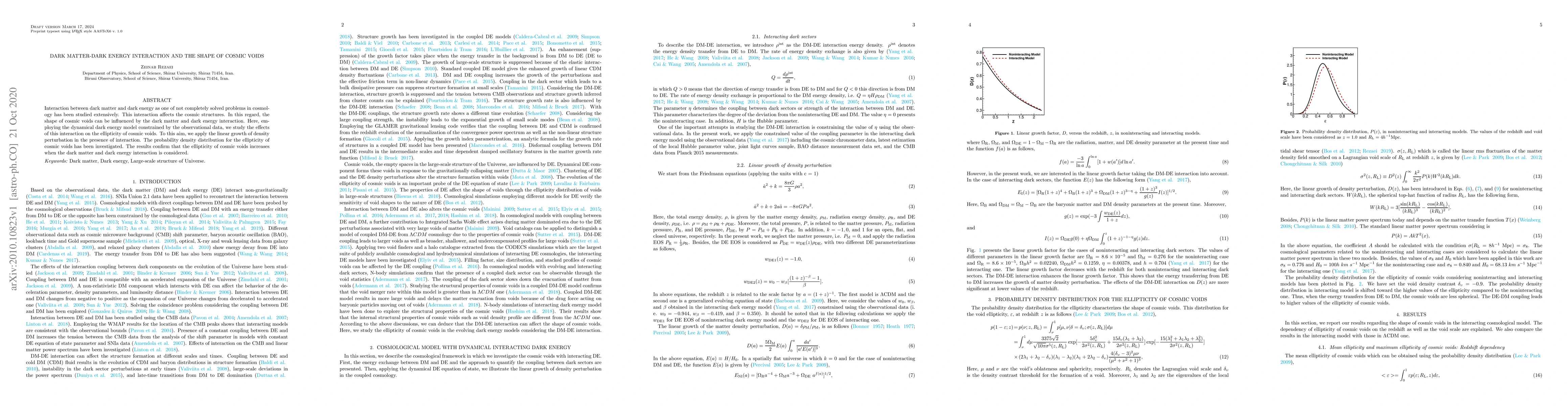 This paper investigates how the interaction between dark matter and dark energy influences the shape of cosmic voids, finding that the ellipticity of voids increases with this interaction. The study uses a dynamical dark energy model constrained by observational data and linear growth of density perturbations to analyze the probability density distribution for void ellipticity.