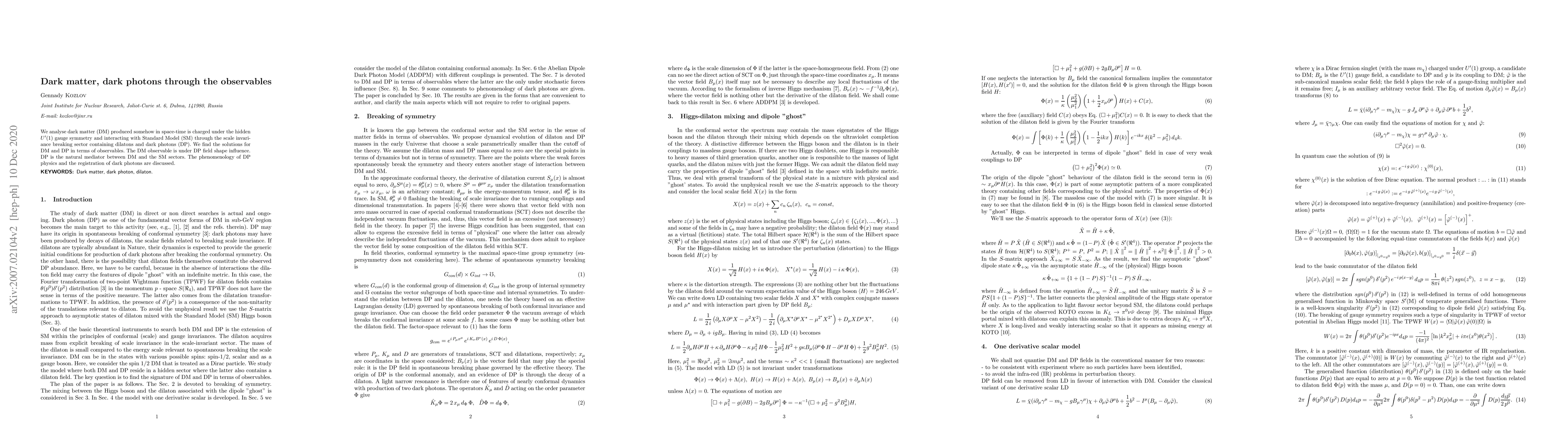 We analyse dark matter (DM) produced somehow in space-time is charged under the hidden $U^{\prime} (1)$ gauge symmetry and interacting with Standard Model (SM) through the scale invariance breaking sector containing dilatons and dark photons (DP). We find the solutions for DM and DP in terms of observables. The DM observable is under DP field shape influence. DP is the natural mediator between DM and the SM sectors. The phenomenology of DP physics and the registration of dark photons are discussed.