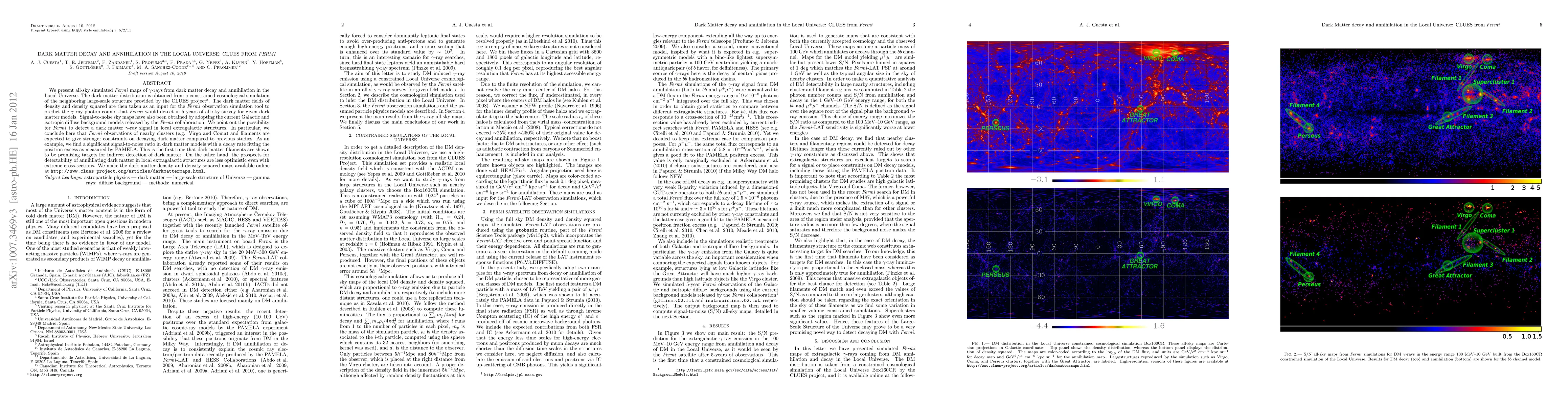 This paper simulates Fermi gamma-ray maps from dark matter decay and annihilation in the Local Universe using data from the CLUES project. It finds that Fermi could detect a dark matter gamma-ray signal from nearby clusters and filaments, particularly in models explaining the positron excess, marking filaments as promising targets for dark matter detection. However, prospects for detecting annihilating dark matter remain less optimistic.