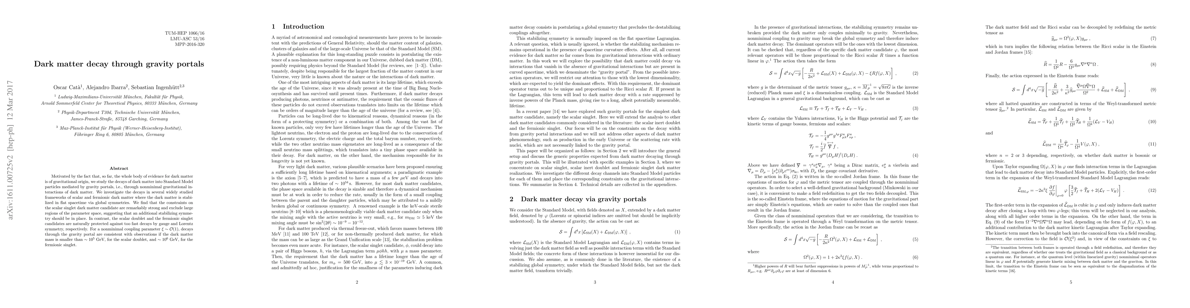 This paper explores the decay of dark matter into Standard Model particles via gravity portals, finding strong constraints on scalar singlet dark matter due to rapid decay, while scalar doublet and fermionic singlet candidates are naturally protected by gauge and Lorentz symmetries, respectively. For certain coupling parameters, decay is consistent with observations if dark matter masses are below specific thresholds.
