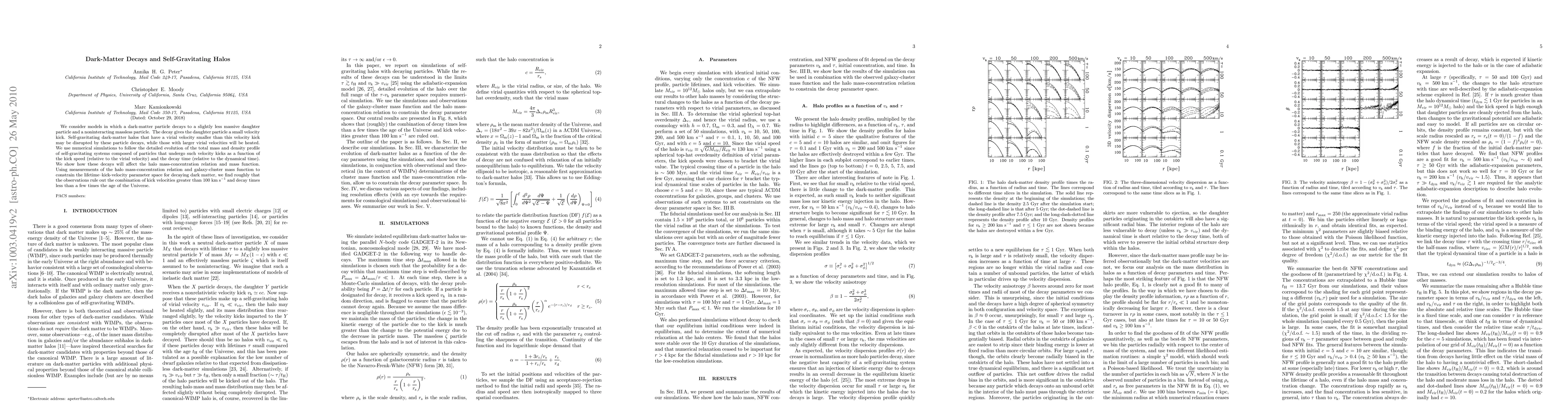 This paper investigates dark-matter decay models where a particle decays into a slightly less massive daughter and a massless particle, potentially disrupting self-gravitating halos. Numerical simulations show that such decays affect the halo mass-concentration relation and mass function, ruling out decay velocities over 100 km/s and decay times shorter than the age of the Universe.