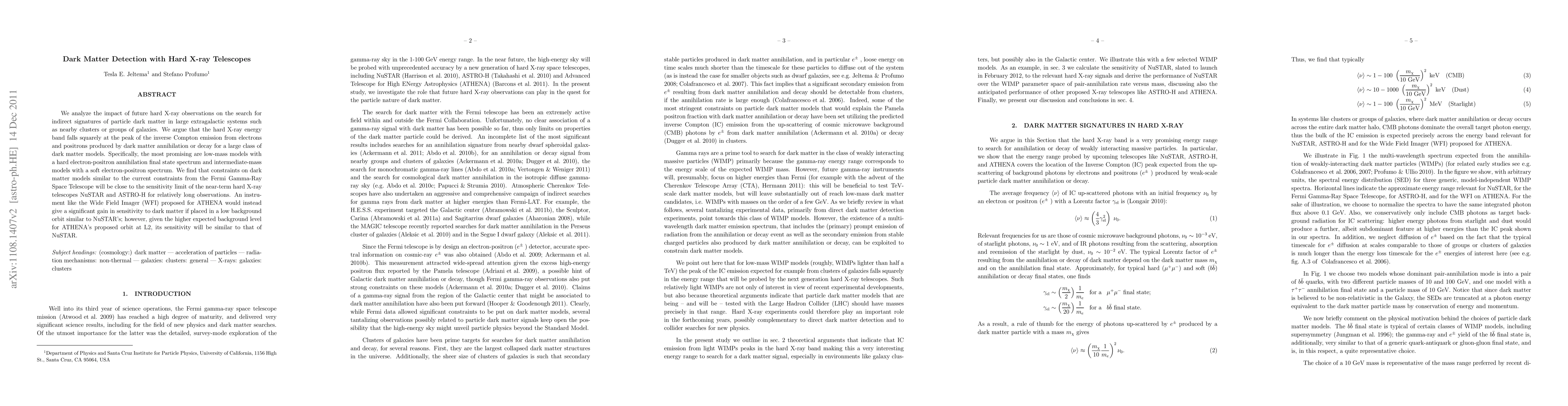 This paper explores how future hard X-ray telescopes can detect indirect signatures of particle dark matter, particularly focusing on low-mass and intermediate-mass models. It concludes that while NuSTAR and ASTRO-H will reach near-current Fermi Gamma-Ray limits, the proposed Wide Field Imager for ATHENA could significantly enhance sensitivity if deployed in a low background orbit.