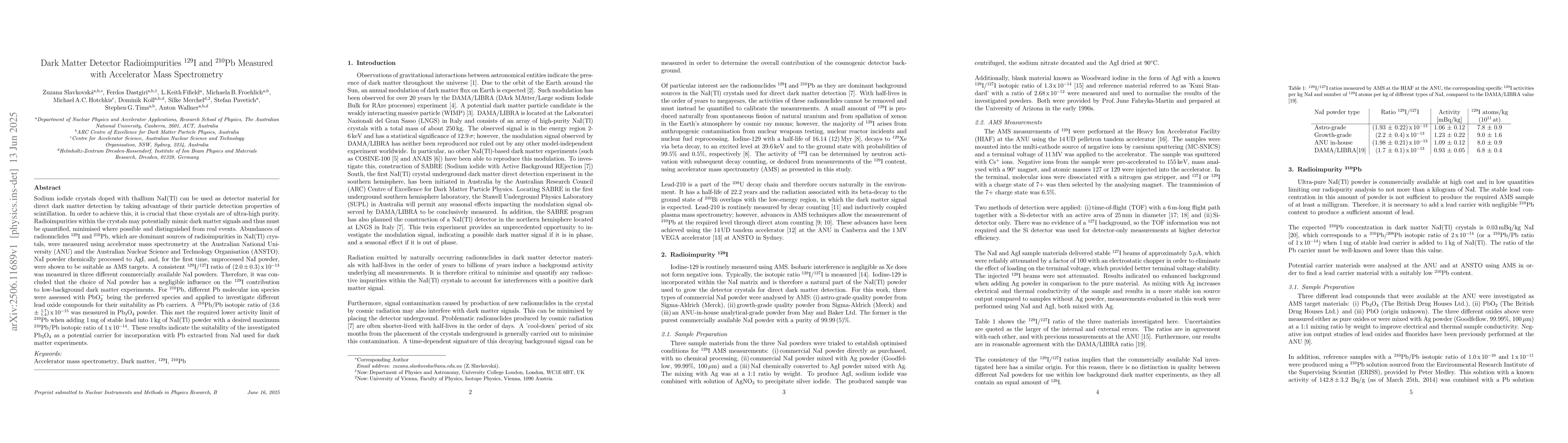 Sodium iodide crystals doped with thallium NaI(Tl) can be used as detector material for direct dark matter detection by taking advantage of their particle detection properties of scintillation. In order to achieve this, it is crucial that these crystals are of ultra-high purity. Radioimpurities within the crystals may potentially mimic dark matter signals and thus must be quantified, minimised where possible and distinguished from real events. Abundances of radionuclides $^{129}$I and $^{210}$Pb, which are dominant sources of radioimpurities in NaI(Tl) crystals, were measured using accelerator mass spectrometry at the Australian National University (ANU) and the Australian Nuclear Science and Technology Organisation (ANSTO). NaI powder chemically processed to AgI, and, for the first time, unprocessed NaI powder, were shown to be suitable as AMS targets. A consistent $^{129}$I/$^{127}$I ratio of (2.0 $\pm$ 0.3) x 10$^{-13}$ was measured in three different commercially available NaI powders. Therefore, it was concluded that the choice of NaI powder has a negligible influence on the $^{129}$I contribution to low-background dark matter experiments. For $^{210}$Pb, different Pb molecular ion species were assessed with PbO$_2^-$ being the preferred species and applied to investigate different lead oxide compounds for their suitability as Pb carriers. A $^{210}$Pb/Pb isotopic ratio of (3.6 $\pm$ $^{1.7}_{1.4}$) x 10$^{-15}$ was measured in Pb$_3$O$_4$ powder. This met the required lower activity limit of $^{210}$Pb when adding 1 mg of stable lead into 1 kg of NaI(Tl) powder with a desired maximum $^{210}$Pb/Pb isotopic ratio of 1 x 10$^{-14}$. These results indicate the suitability of the investigated Pb$_3$O$_4$ as a potential carrier for incorporation with Pb extracted from NaI used for dark matter experiments.