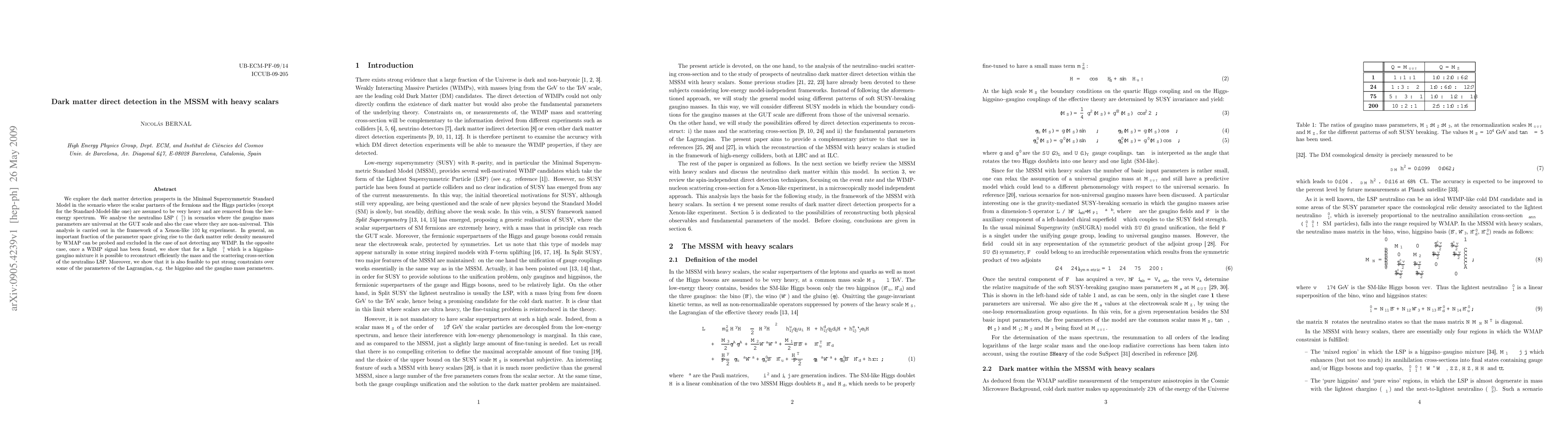 We explore the dark matter detection prospects in the Minimal Supersymmetric Standard Model in the scenario where the scalar partners of the fermions and the Higgs particles (except for the Standard-Model-like one) are assumed to be very heavy and are removed from the low-energy spectrum. We analyse the neutralino LSP ($\chi_1^0$) in scenarios where the gaugino mass parameters are universal at the GUT scale and also the case where they are non-universal. This analysis is carried out in the framework of a Xenon-like 100 kg experiment. In general, an important fraction of the parameter space giving rise to the dark matter relic density measured by WMAP can be probed and excluded in the case of not detecting any WIMP. In the opposite case, once a WIMP signal has been found, we show that for a light $\chi_1^0$ which is a higgsino-gaugino mixture it is possible to reconstruct efficiently the mass and the scattering cross-section of the neutralino LSP. Moreover, we show that it is also feasible to put strong constraints over some of the parameters of the Lagrangian, e.g. the higgsino and the gaugino mass parameters.
