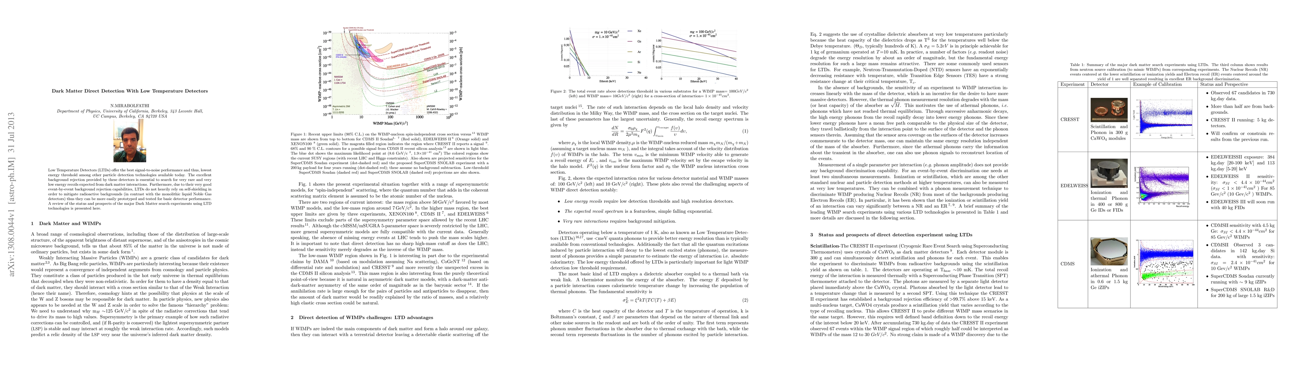 This paper reviews the use of Low Temperature Detectors (LTDs) for dark matter direct detection, highlighting their superior signal-to-noise performance and background rejection, which are crucial for detecting rare, low-energy dark matter interactions. It also notes that LTDs require less self-shielding compared to liquid Noble Gas detectors, facilitating easier prototyping and testing.